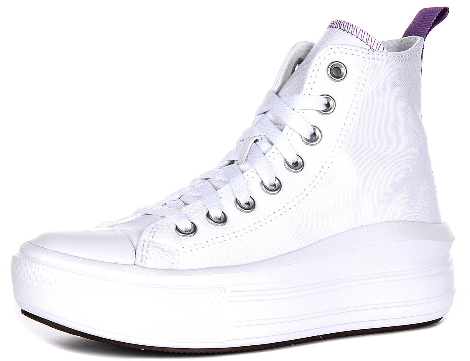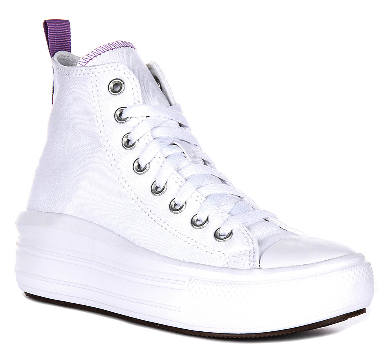 Constructed with a durable textile outer material, these trainers ensure breathability and flexibility, keeping feet comfortable throughout the day. The crisp white design is complemented by eye-catching purple accents on the heel tab and tongue lining, adding a playful touch of colour to the iconic silhouette. The signature Converse branding on the side completes the look, showcasing a timeless appeal that never goes out of style.