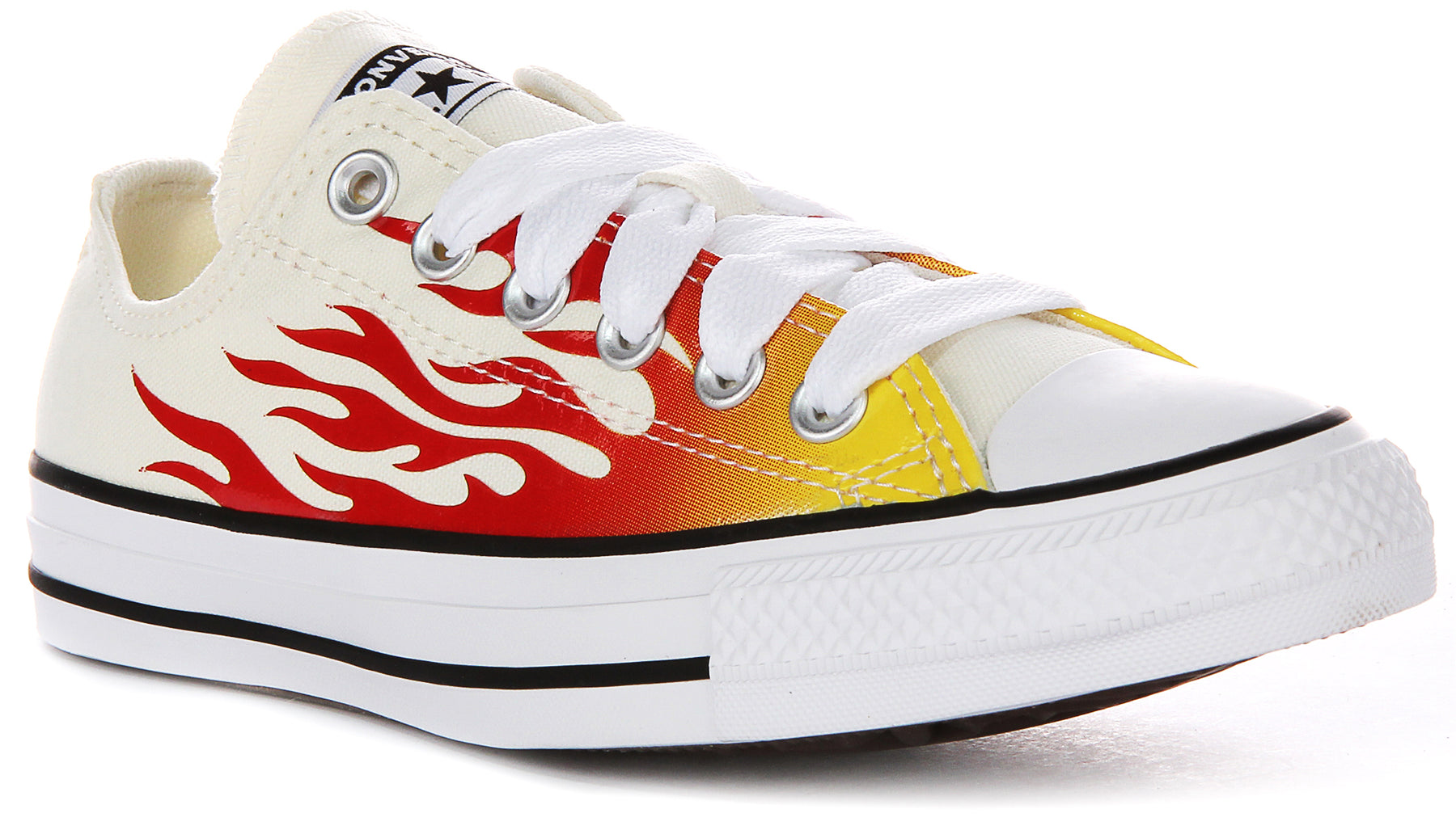 The iconic Chuck Taylor silhouette remains intact, featuring a high top construction with lace up closure for a secure and adjustable fit. With a durable textile upper and rubber toe cap, these trainers offer both style and functionality. Crafted with a white canvas base, these trainers are adorned with bold red flame motifs, creating a dynamic and eye catching design.