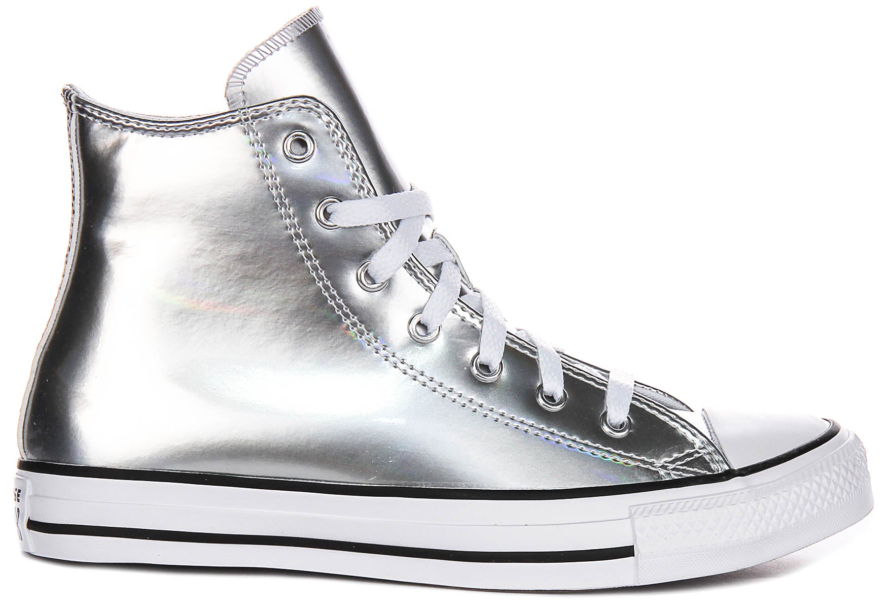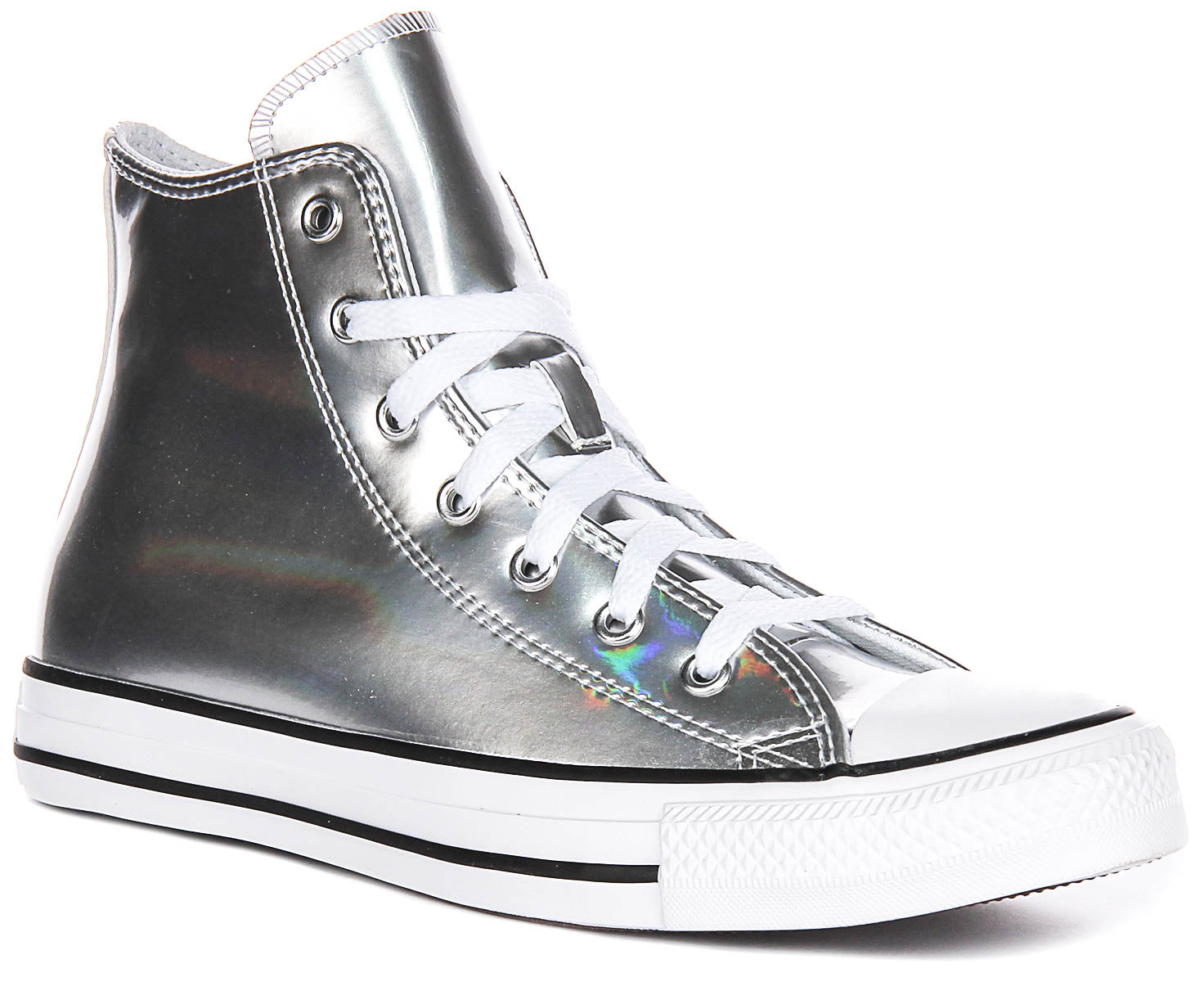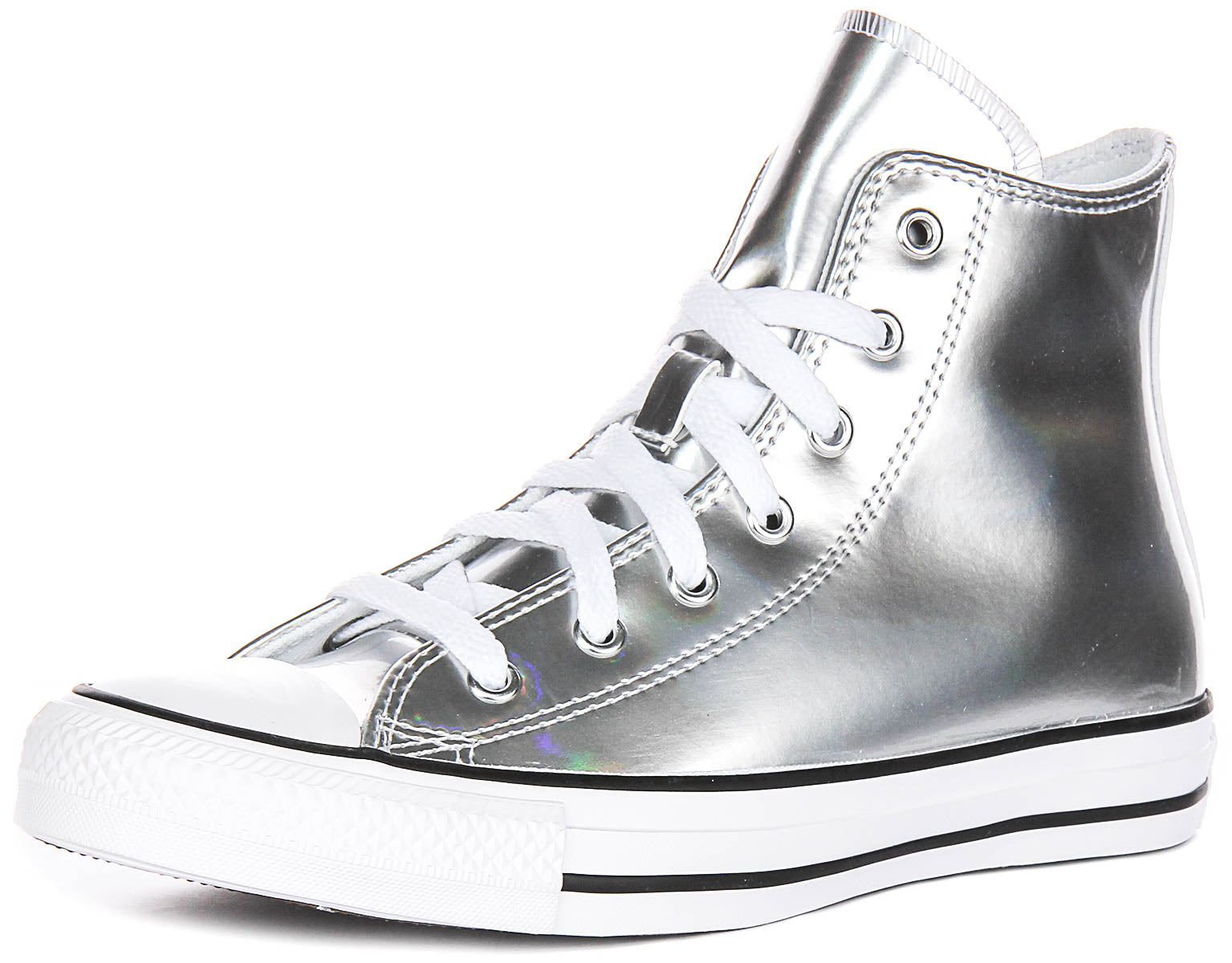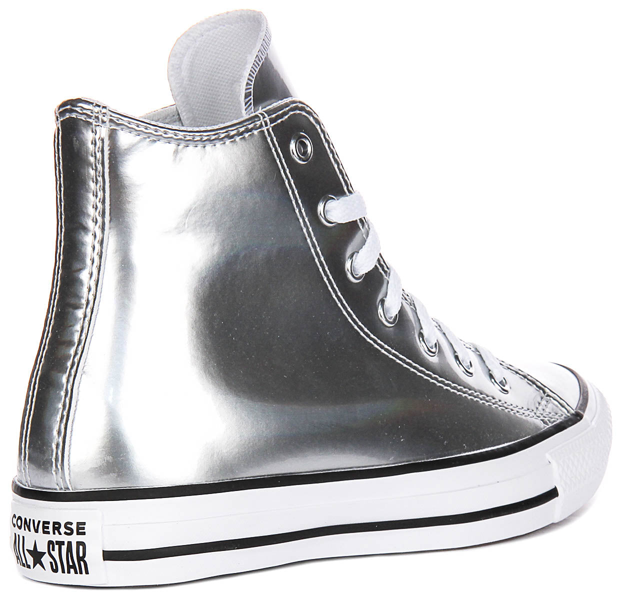Make a bold statement with the Converse A12604C Junior Textile Trainers – a high-top silhouette crafted for young trendsetters who love standout style. The eye-catching metallic silver finish delivers a sleek, mirror-like look that instantly elevates everyday outfits while staying true to Converse’s timeless design DNA.