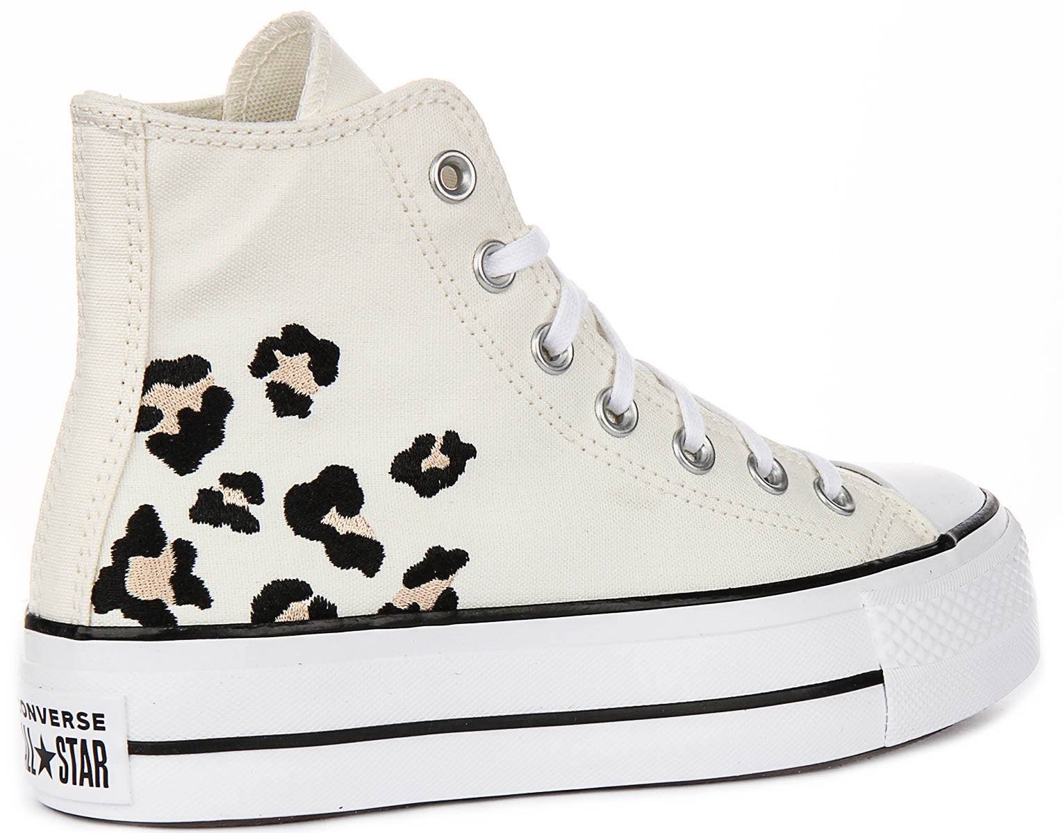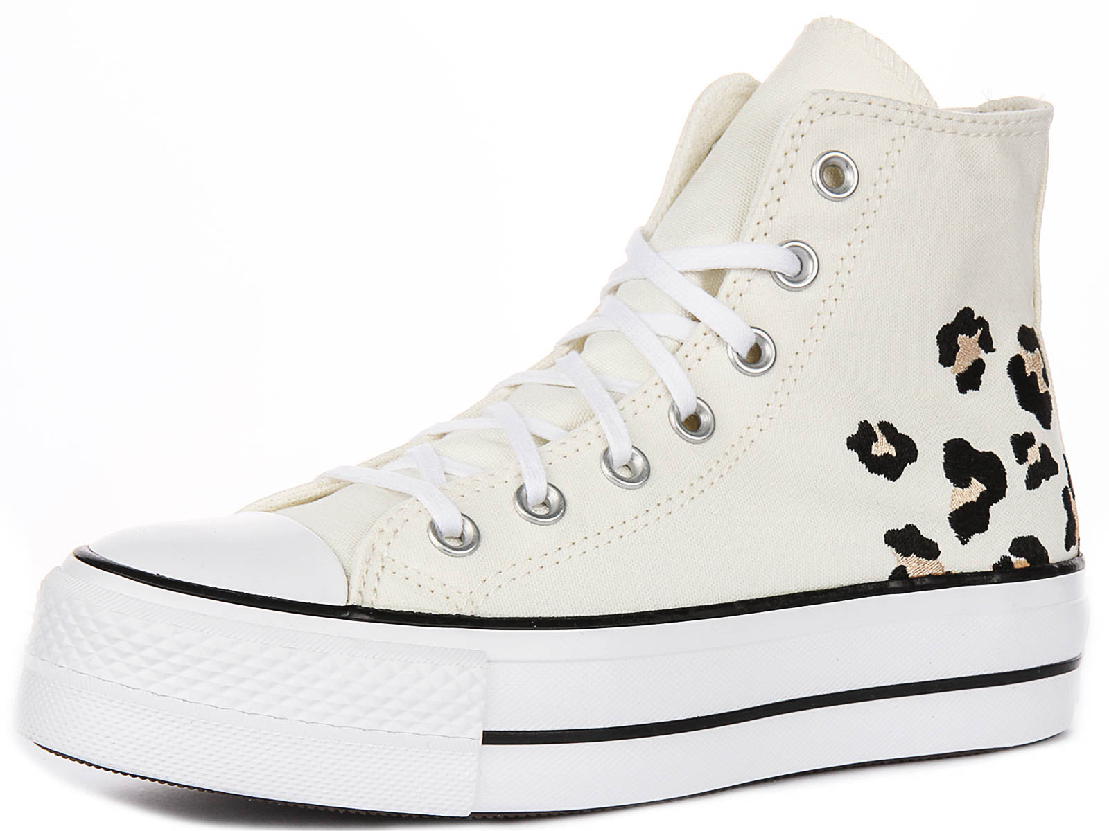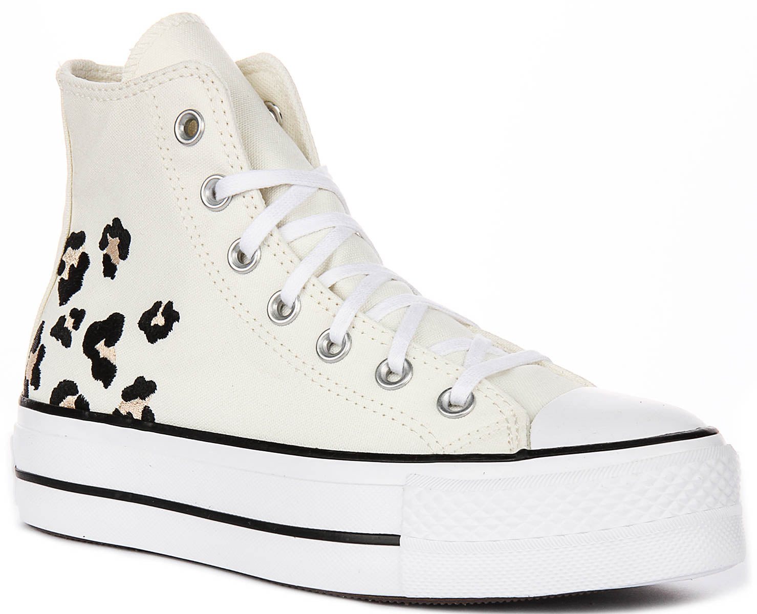 The trainers feature a striking off-white upper, accentuated by bold black and beige leopard print details on the side panels, adding a playful yet fashionable edge to your footwear collection. The iconic Converse All Star patch on the ankle further enhances the signature look, while the traditional high-top silhouette ensures ankle support and a timeless aesthetic.