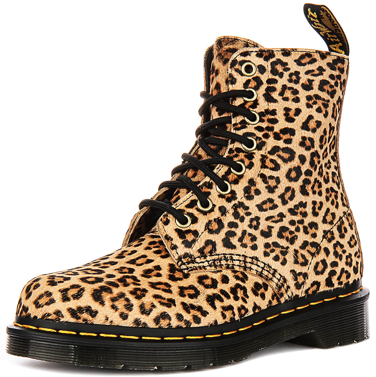 The defining feature of these 1460 Pascal boots is their striking leopard print outer material. Made from premium leather, the finish provides a luxurious and tactile pony-effect texture, replicating the authentic look and feel of real fur. The classic silhouette of the eight-eyelet boot is maintained, featuring robust black laces and gleaming brass-toned eyelets that perfectly complement the natural tones of the leopard print, ensuring a secure and adjustable fit.