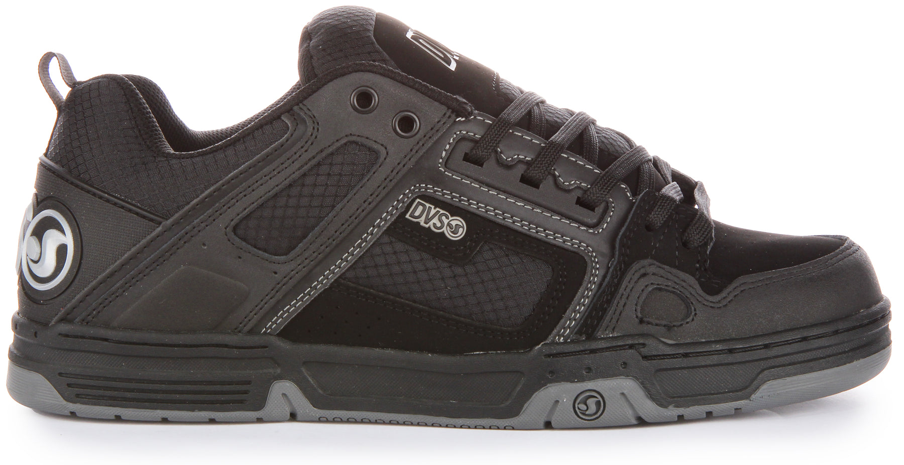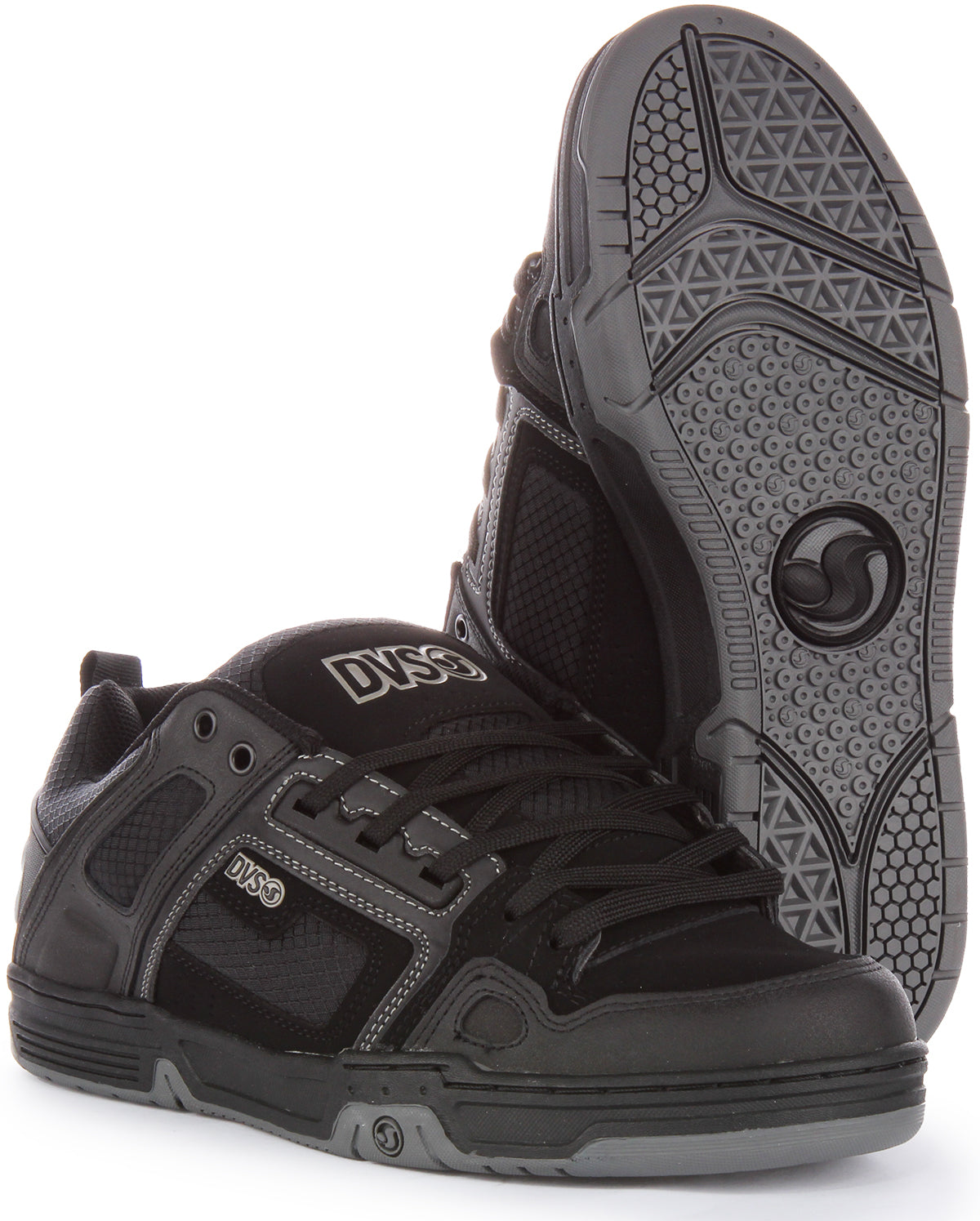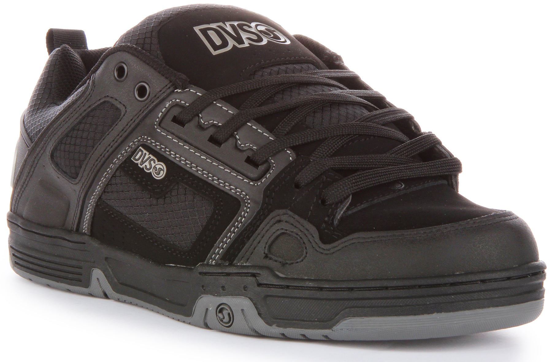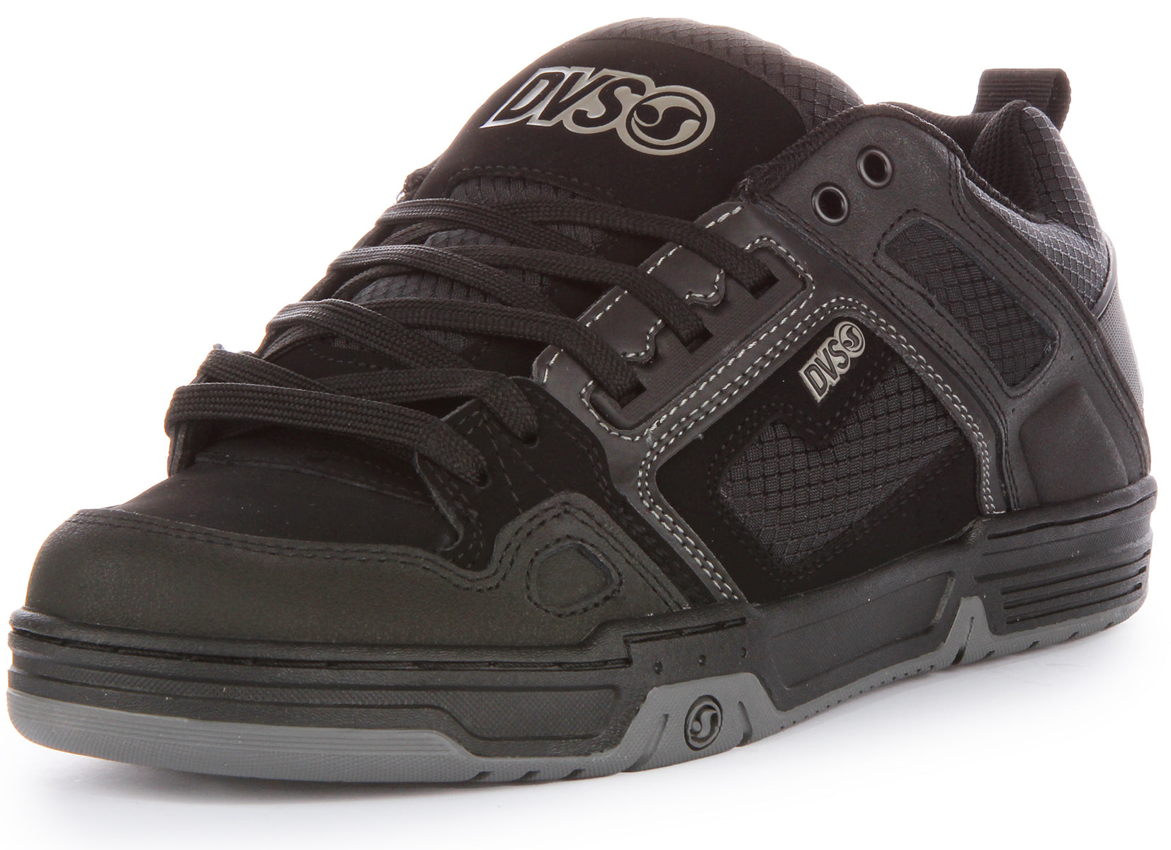 Beneath, a chunky black midsole provides excellent shock absorption, crucial for both comfort and performance, with subtle dark grey accents adding to the dynamic aesthetic. The durable rubber outsole, presented in a dark grey finish, features a multi-directional grip pattern with a combination of circular and triangular lugs, designed to offer superior traction and stability on various surfaces. A smaller Dvs logo is integrated into the outsole design, a testament to the brand's attention to detail.