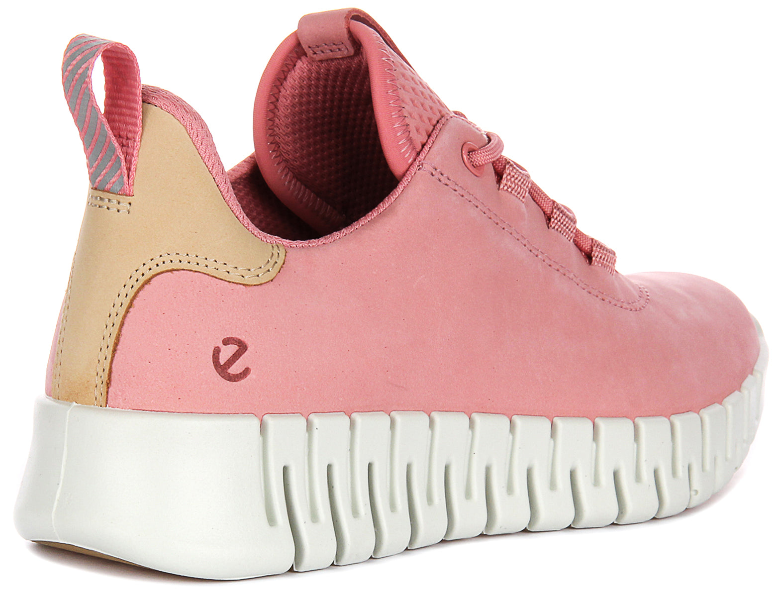 Product details: Brand: Ecco. Product name: Gruuv W. Product type: Shoes. Outer material: Nubuck leather. Target gender/group: Womens. Colour: Rose Pink with Beige heel and White sole (colour code not specified). Other features: lace‑up closure, breathable mesh tongue, padded collar, striped heel pull tab, flexible segmented sole, grippy gum outsole.