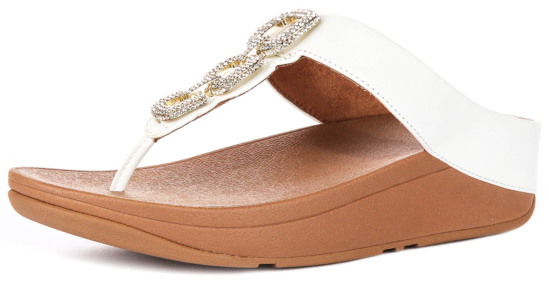 Introducing the Fitflop Fino Crystal Sandals, a stunning choice for women who appreciate both comfort and sophisticated style. Designed by Fitflop, a renowned name in ergonomic footwear, these sandals perfectly combine luxury with everyday practicality. The elegant thong design features a crisp white leather upper, providing a fresh, modern look that is easy to pair with any summer wardrobe.