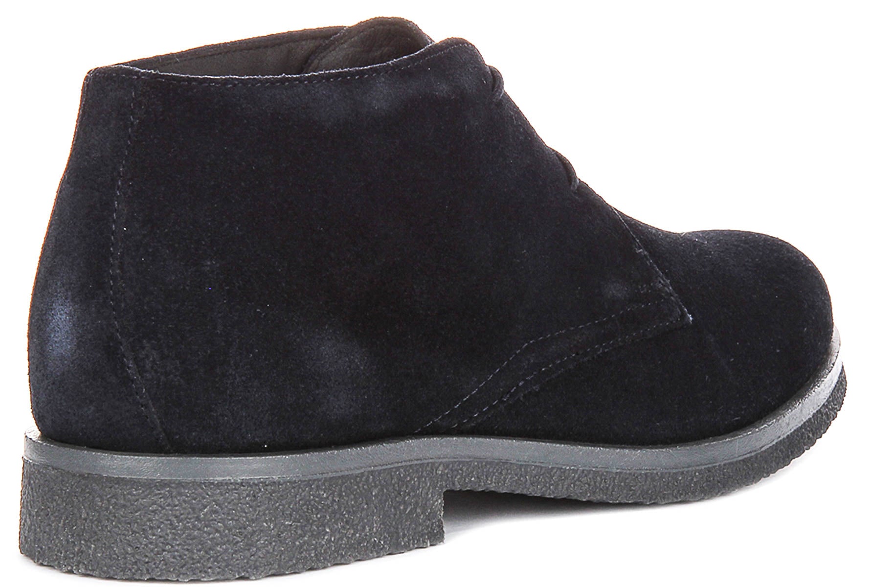 The upper of these distinguished boots is made from premium suede leather, offering a wonderfully soft touch and a luxurious matte finish. Presented in a deep navy blue, the rich colour provides a subtle alternative to traditional black, offering incredible versatility that pairs effortlessly with a wide range of wardrobe options, from tailored trousers to smart denim. The classic two-eyelet lace-up fastening ensures a secure and adjustable fit, while the clean lines and understated stitching contribute to their timeless chukka-inspired design.