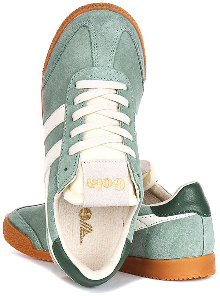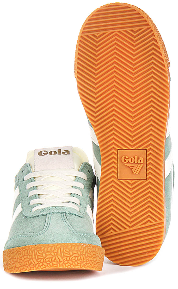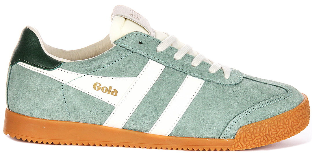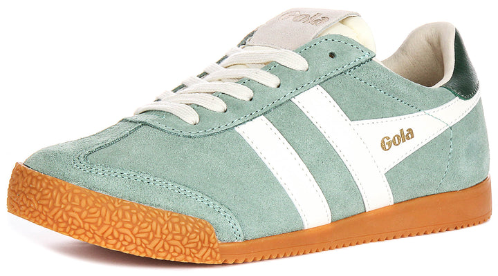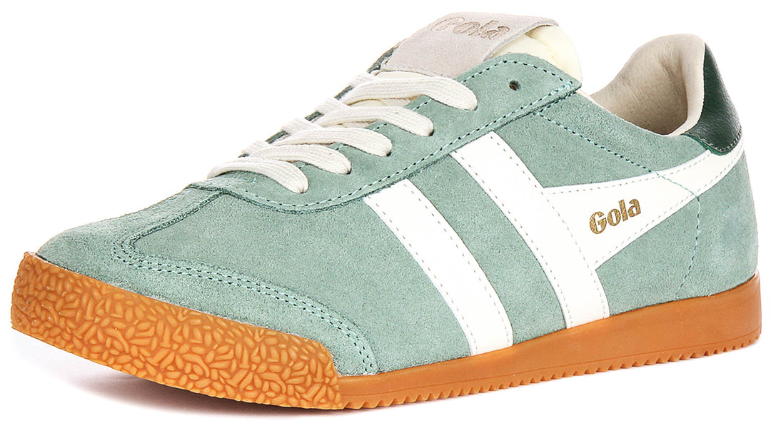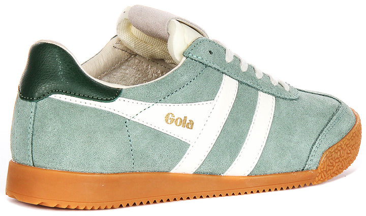 Crafted with a premium suede leather outer material, this pair features a soft, textured finish that exudes quality and sophistication. The trainers are predominantly in a pastel green shade, which offers a fresh and understated aesthetic, making them easy to pair with a variety of outfits. The design is accented with white contrast detailing, including two signature Gola stripes running along the side, as well as branding on the lateral side, tongue, and heel.
