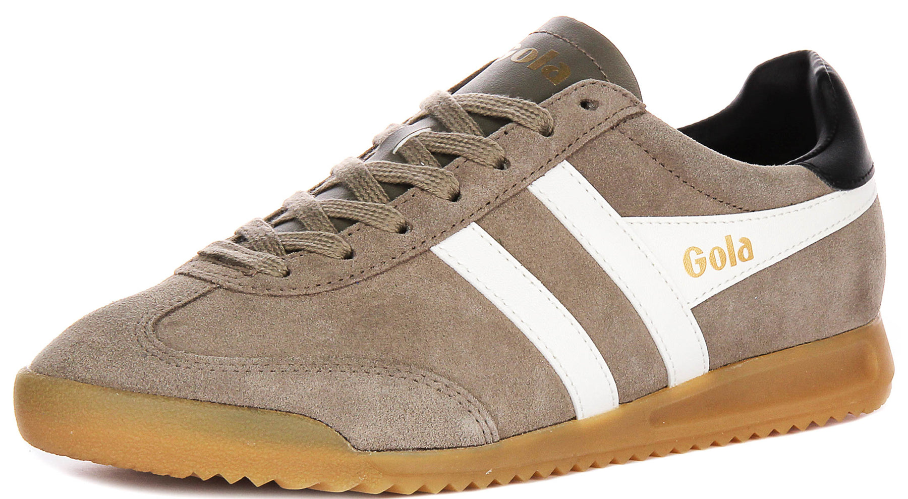 The upper is made from premium suede leather in a refined taupe tone, showcasing the iconic twin Gola wingflash stripes in crisp white for a timeless contrast. Subtle gold Gola branding on the side and tongue adds a vintage nod, while the black heel tab sharpens the overall profile. Tonal laces and carefully stitched overlays complete the sleek, streamlined finish.
