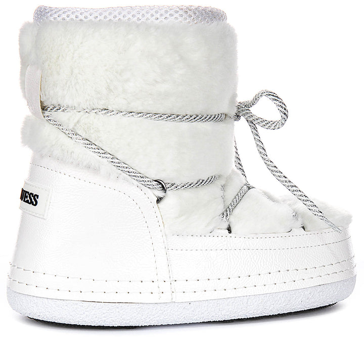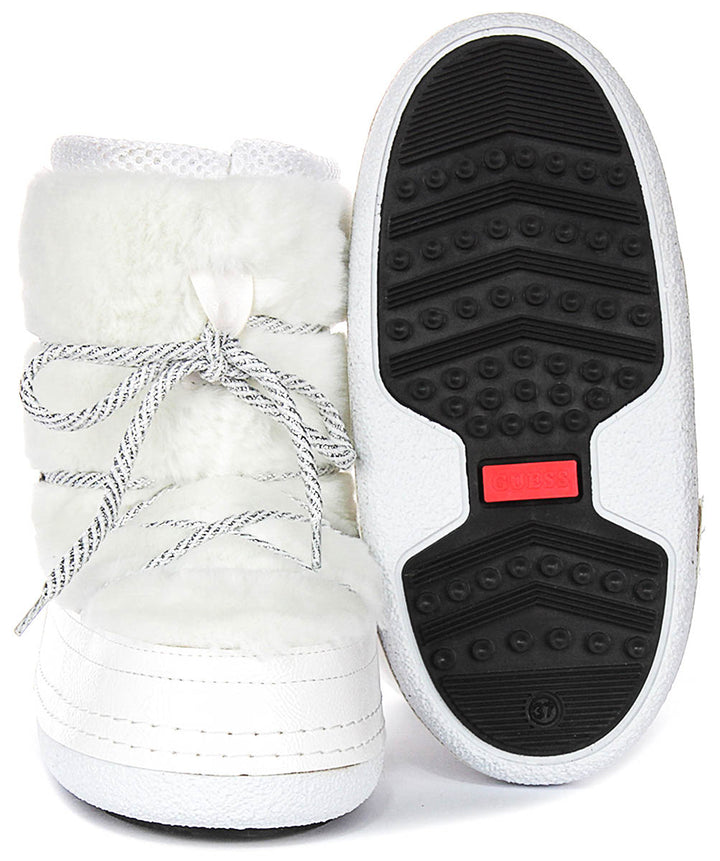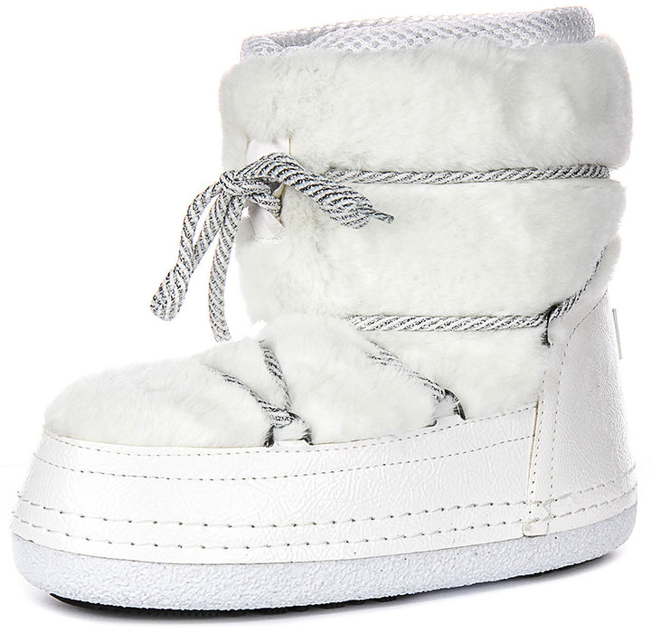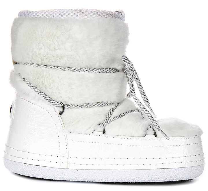 The trainers feature a mid-rise boot design, which provides added warmth and coverage during colder days. The fur-like details on the trainer's upper and inner lining make it a cosy choice, ideal for cooler seasons. The addition of two-tone laces not only secures the fit but also complements the overall aesthetic with a playful, sporty touch.