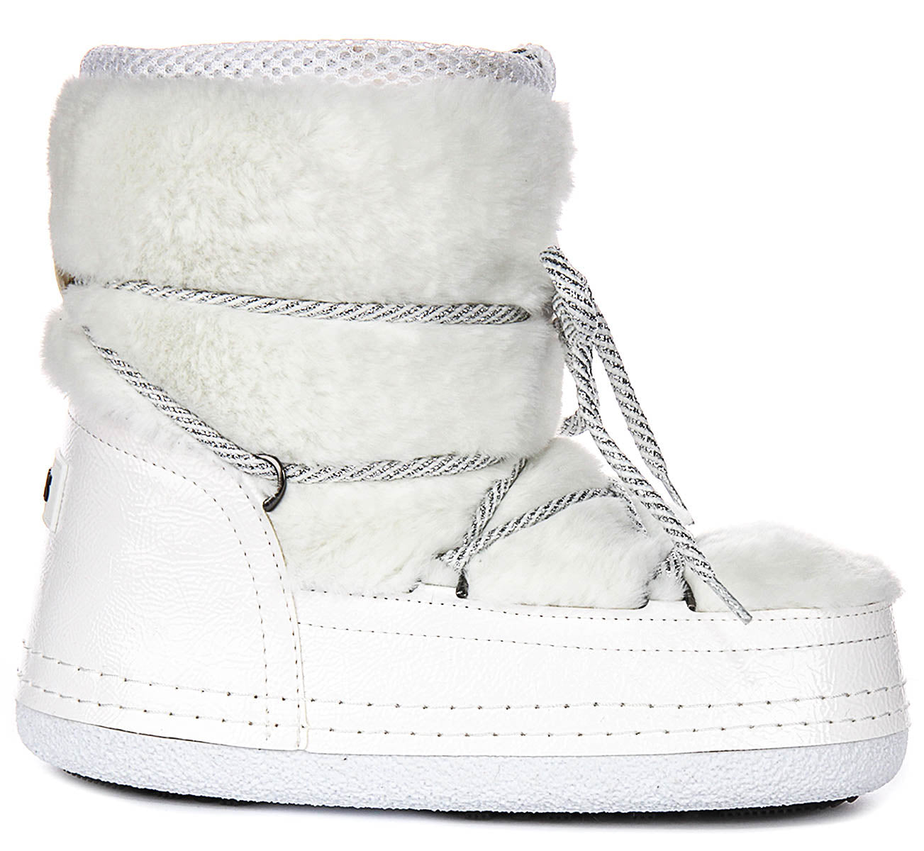 The trainers are made with a faux leather outer material, giving them a sleek and modern appearance. The glossy faux leather contrasts beautifully with the soft, furry detailing encompassing the main body of the shoe, offering both comfort and a chic winter-ready vibe. The combination of textures elevates their design, making them stand out while maintaining their casual appeal.