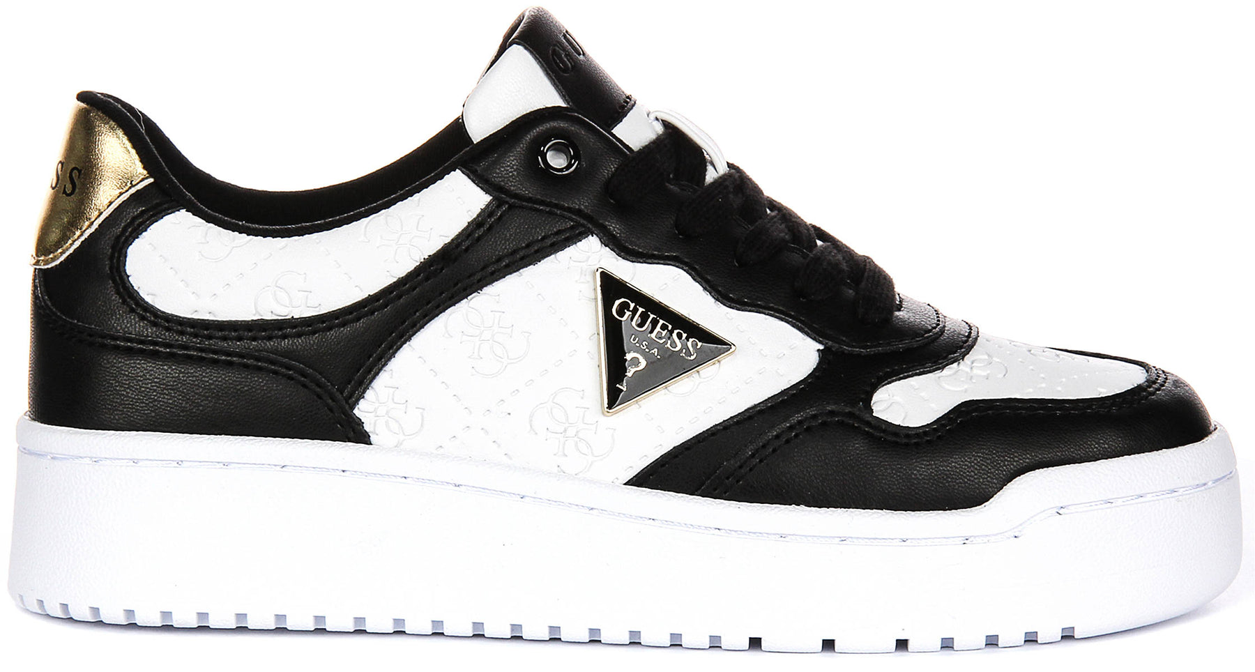 The outer material is premium faux leather, offering an elegant, cruelty-free alternative to traditional leather. The trainers showcase a classic black and white colour scheme, accented by a sophisticated gold heel tab and signature Guess branding. The upper features embossed Guess logos, giving the trainers a distinctive and luxurious touch.