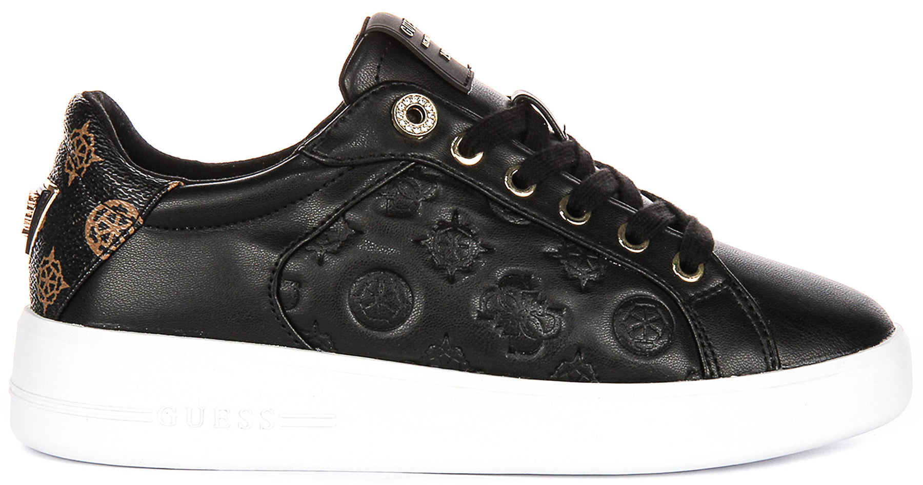 The outer material is crafted from high-quality faux leather, giving these trainers a sleek and sophisticated look while offering durability and easy maintenance. The classic black colour is accented with embossed Guess logos on the sides, providing a subtle yet distinctive branded touch. The trainers are further enhanced with metallic gold-tone details, including branded eyelets and a decorative panel on the heel featuring the signature Guess triangle.