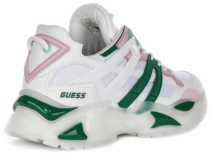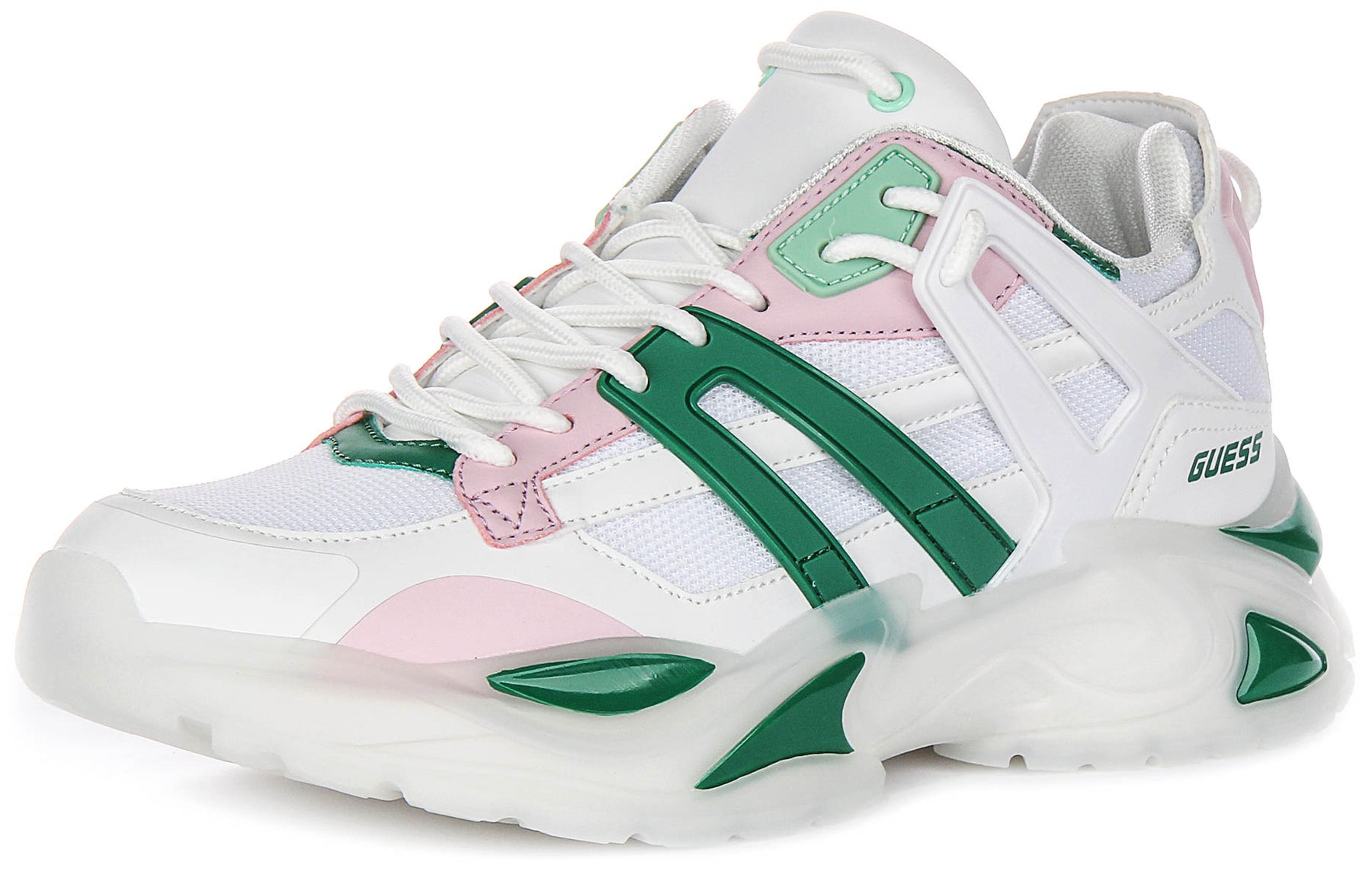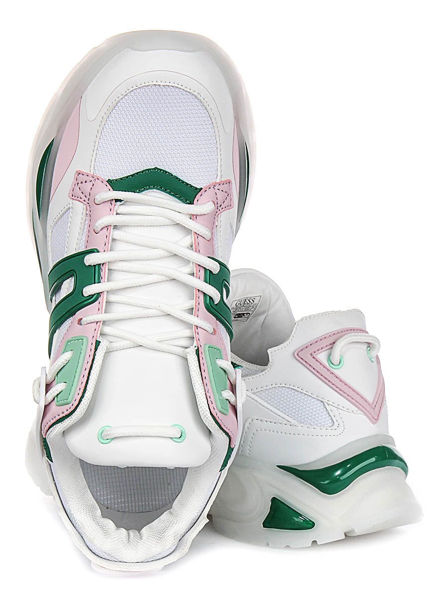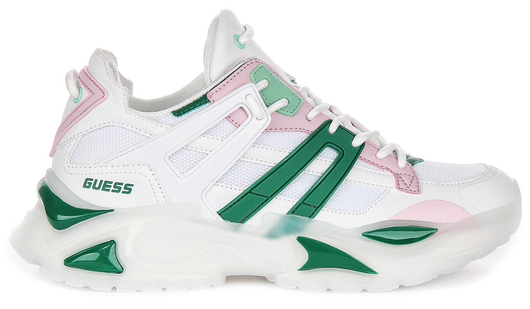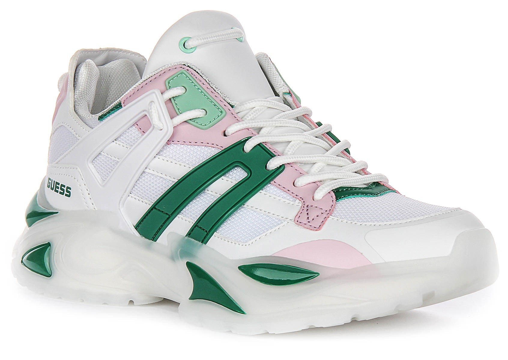 These trainers feature an eye-catching colour palette of white, green, and pink, offering a refreshing aesthetic that stands out. The vibrant green overlays and light pink accents are complemented by a clean, white base, giving the trainers a bold yet feminine appeal. The signature Guess branding is subtly incorporated along the side panel, adding a touch of sophistication.