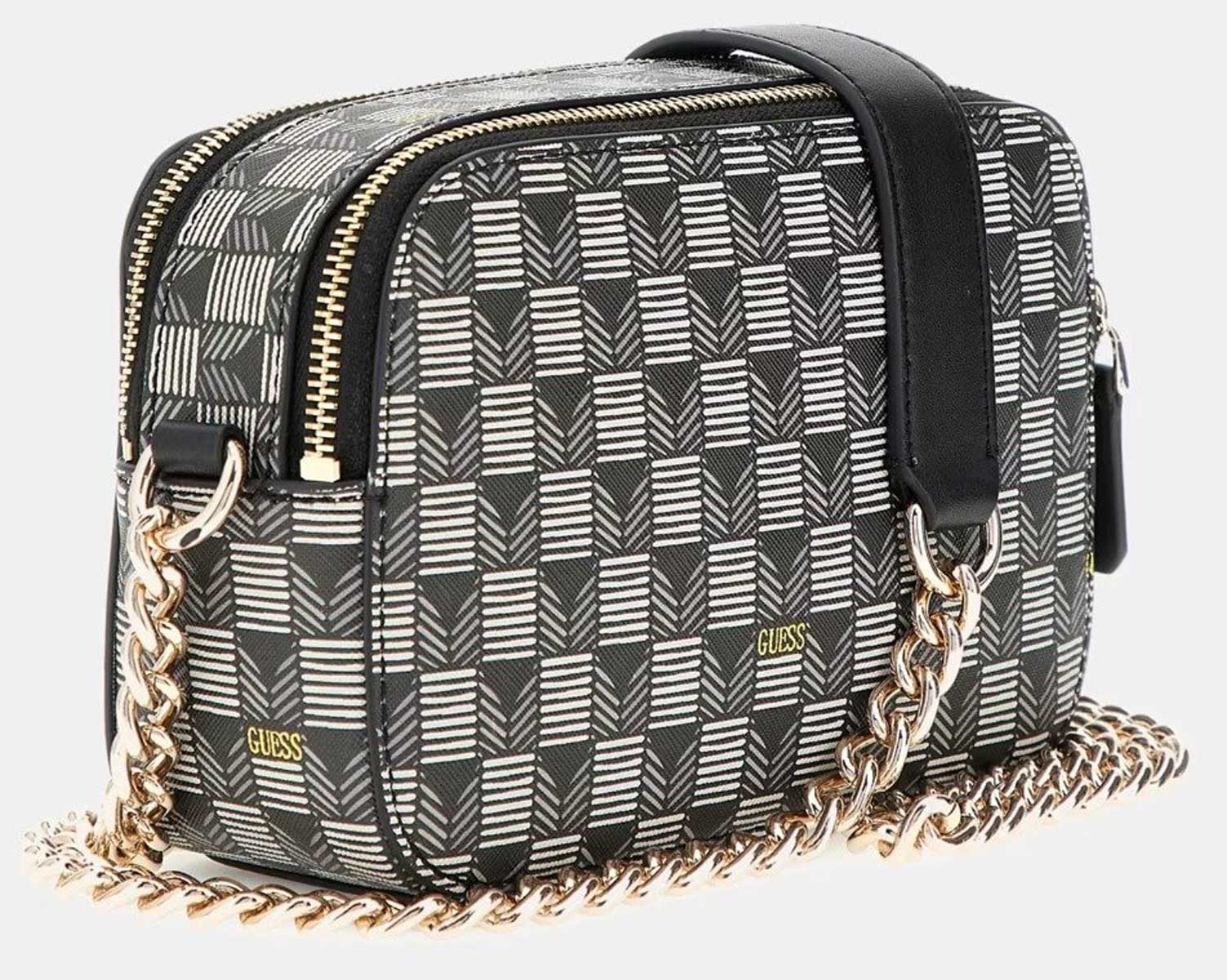 Made from durable synthetic material, the bag boasts a contemporary chequered pattern with subtle hues of black, grey, and white, accented by the iconic Guess logo in gold tones. The standout feature is the signature Guess triangle logo plaque on the front, which adds a touch of luxury to its design. The exterior is both eye-catching and practical, designed to make a bold statement while resisting daily wear and tear.