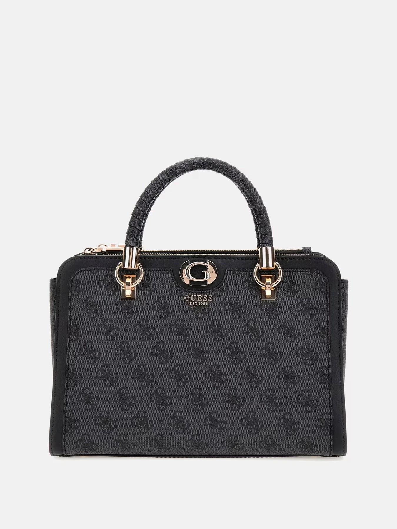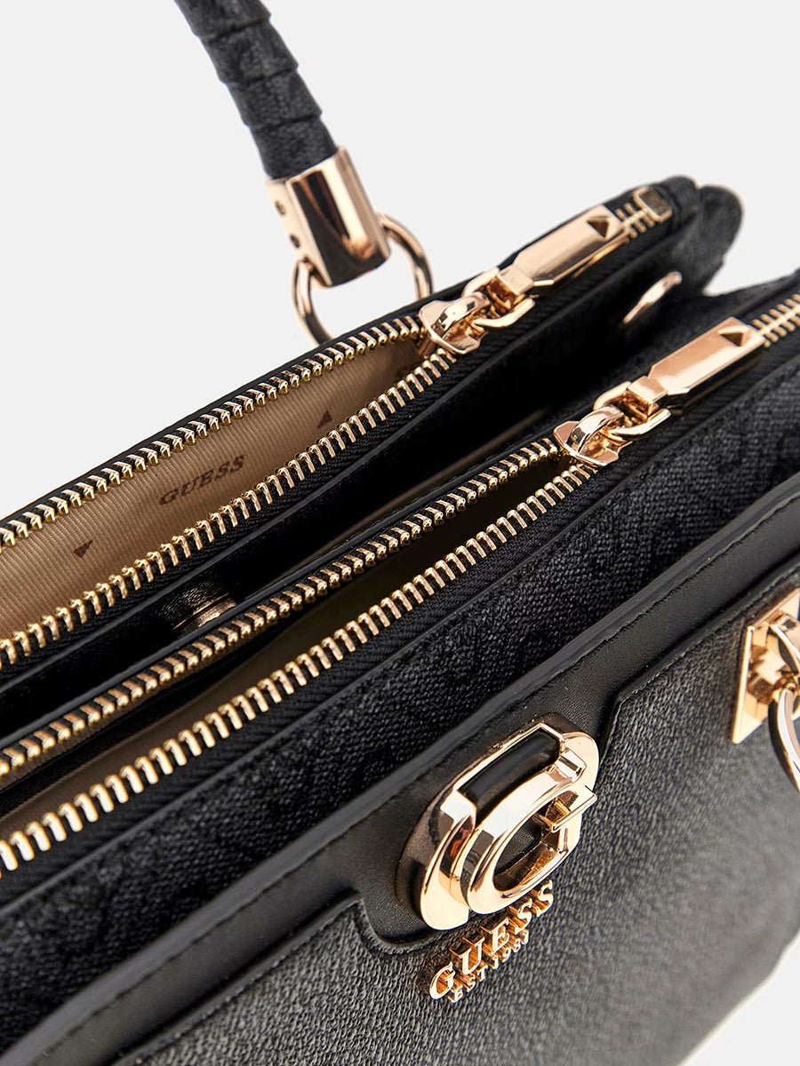 This handbag features a durable and luxurious faux leather outer material, delivering a refined texture with an elegant, subtle sheen. The rich dark hue, complemented by the iconic Guess logo pattern, adds a touch of luxury and timeless appeal to your wardrobe. The structured silhouette maintains its shape, ensuring your bag looks polished from day to night.