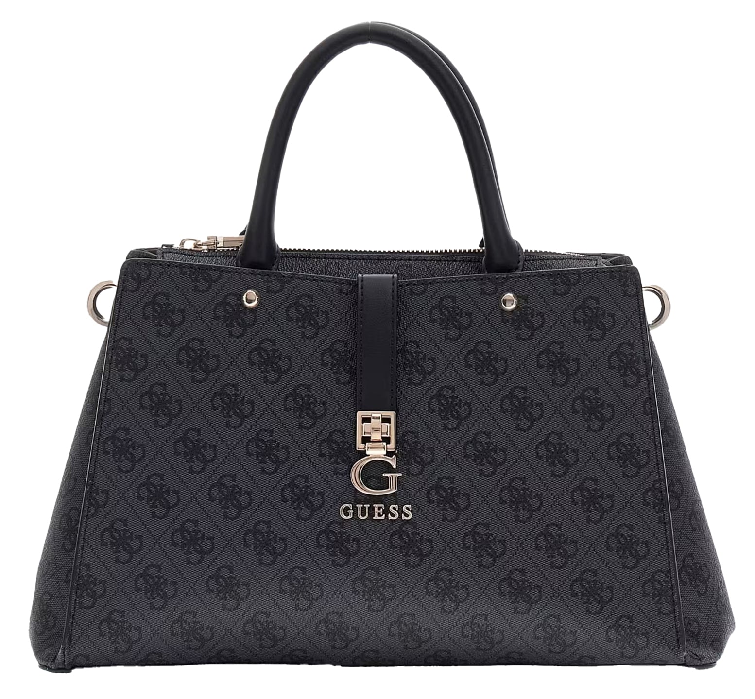 Crafted from high-quality faux leather, this handbag boasts a refined, textured exterior adorned with the iconic Guess logo print throughout, giving it a timeless and luxurious appeal. The classic black colour is complemented by gold-tone hardware, including the prominent Guess emblem and a stylish chain strap detail, adding a touch of glamour to your ensemble.