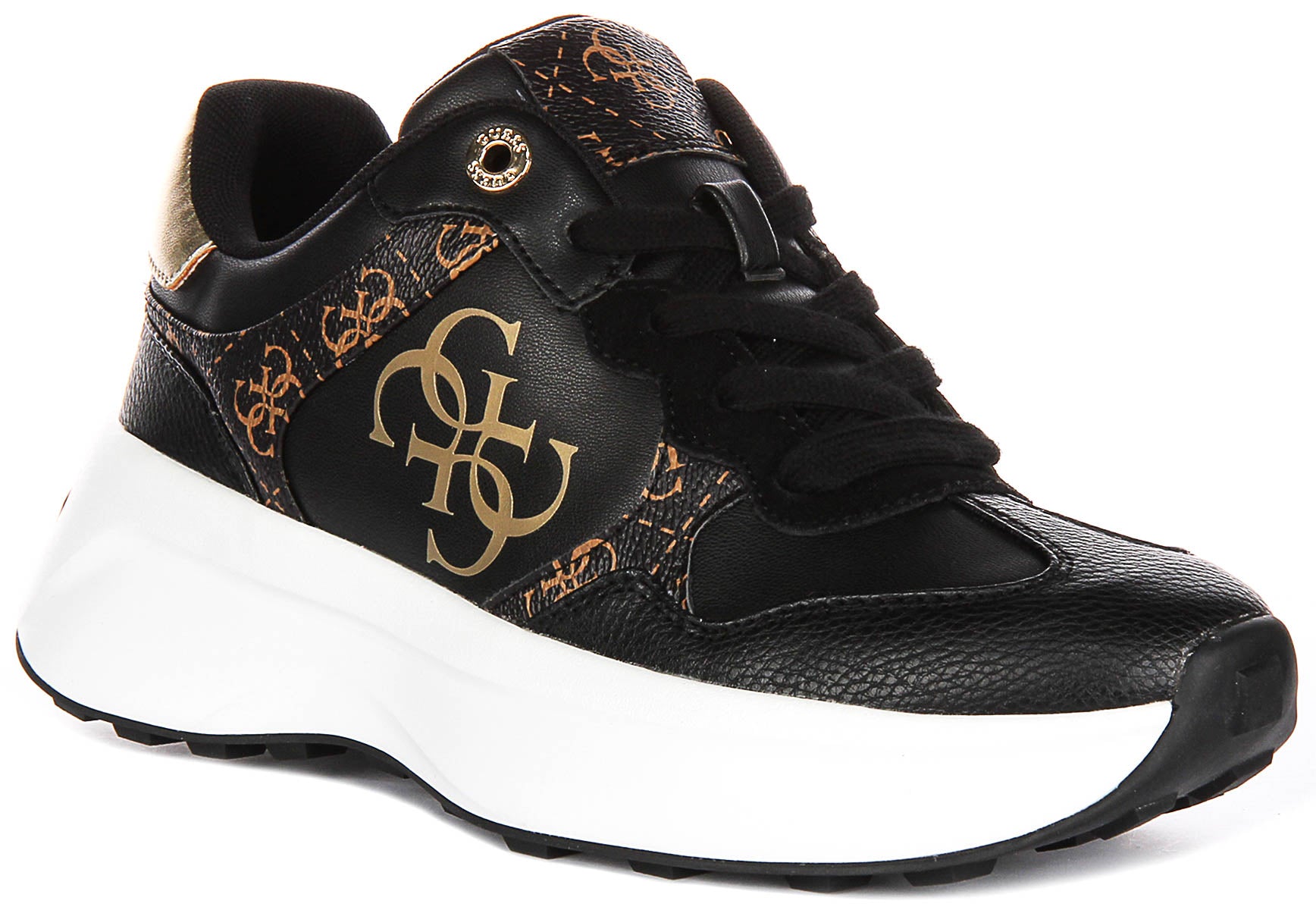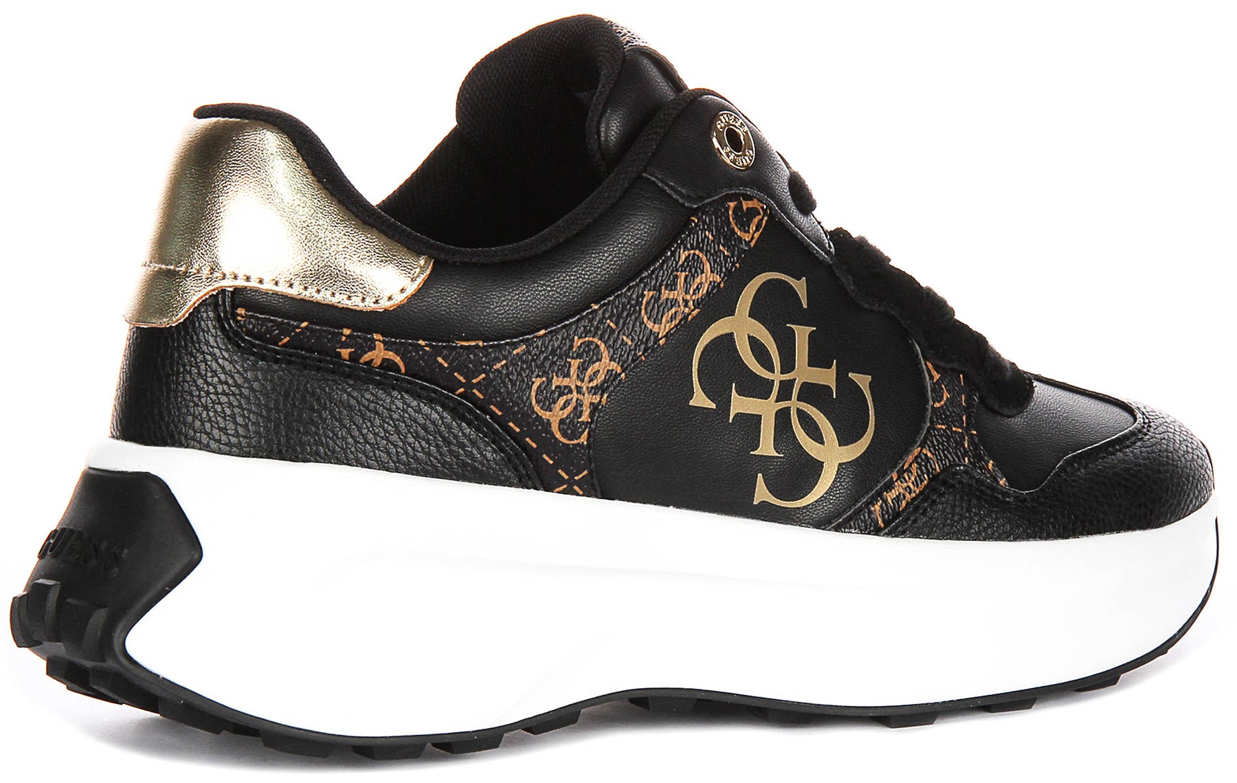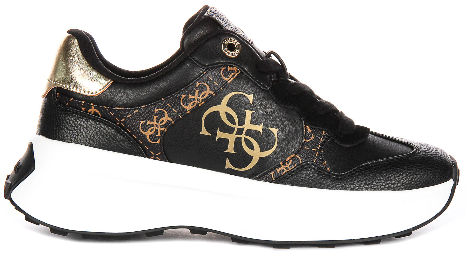 These trainers feature a premium faux leather outer material, providing a sophisticated look with the added benefit of easy maintenance and animal-friendly construction. The upper boasts a striking combination of smooth and textured black faux leather, highlighted by the signature Guess monogram and logo details in elegant gold tones. This eye-catching contrast, along with subtle gold metallic accents at the heel, ensures these trainers will stand out in any footwear collection.
