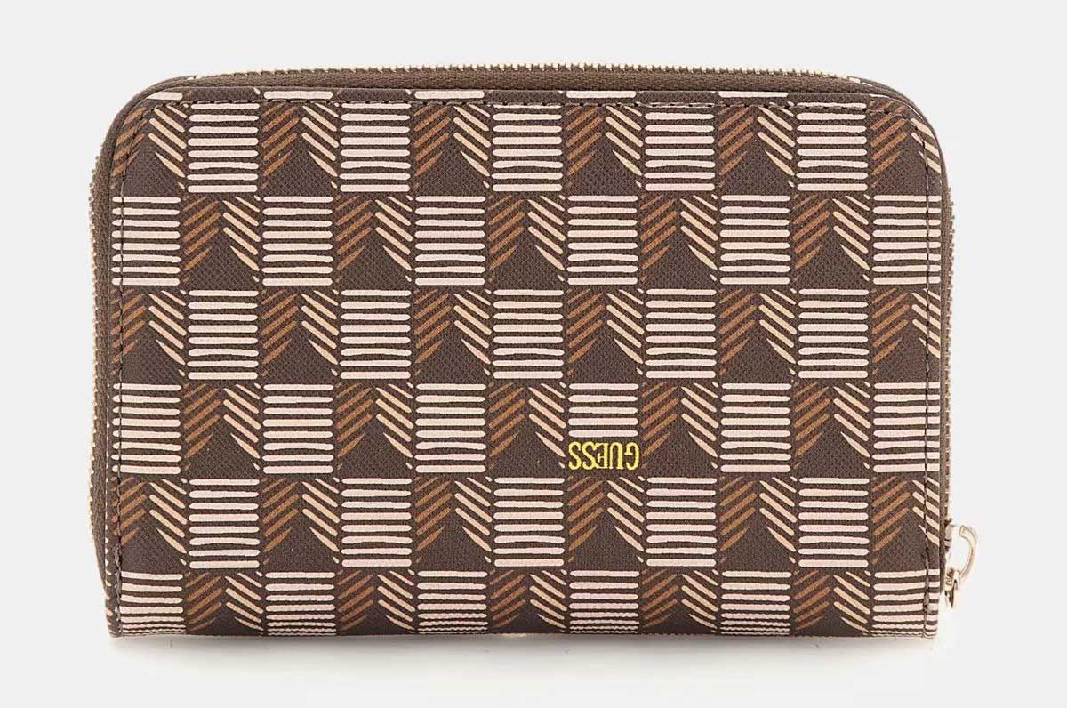 The Guess women's faux leather purse, product name SWJT9344140, is a stylish accessory crafted from high-quality faux leather. Its design is both elegant and practical, catering to the modern woman's needs. The outer material features a unique geometric pattern in shades of brown and cream, offering a timeless aesthetic that complements a variety of outfits.