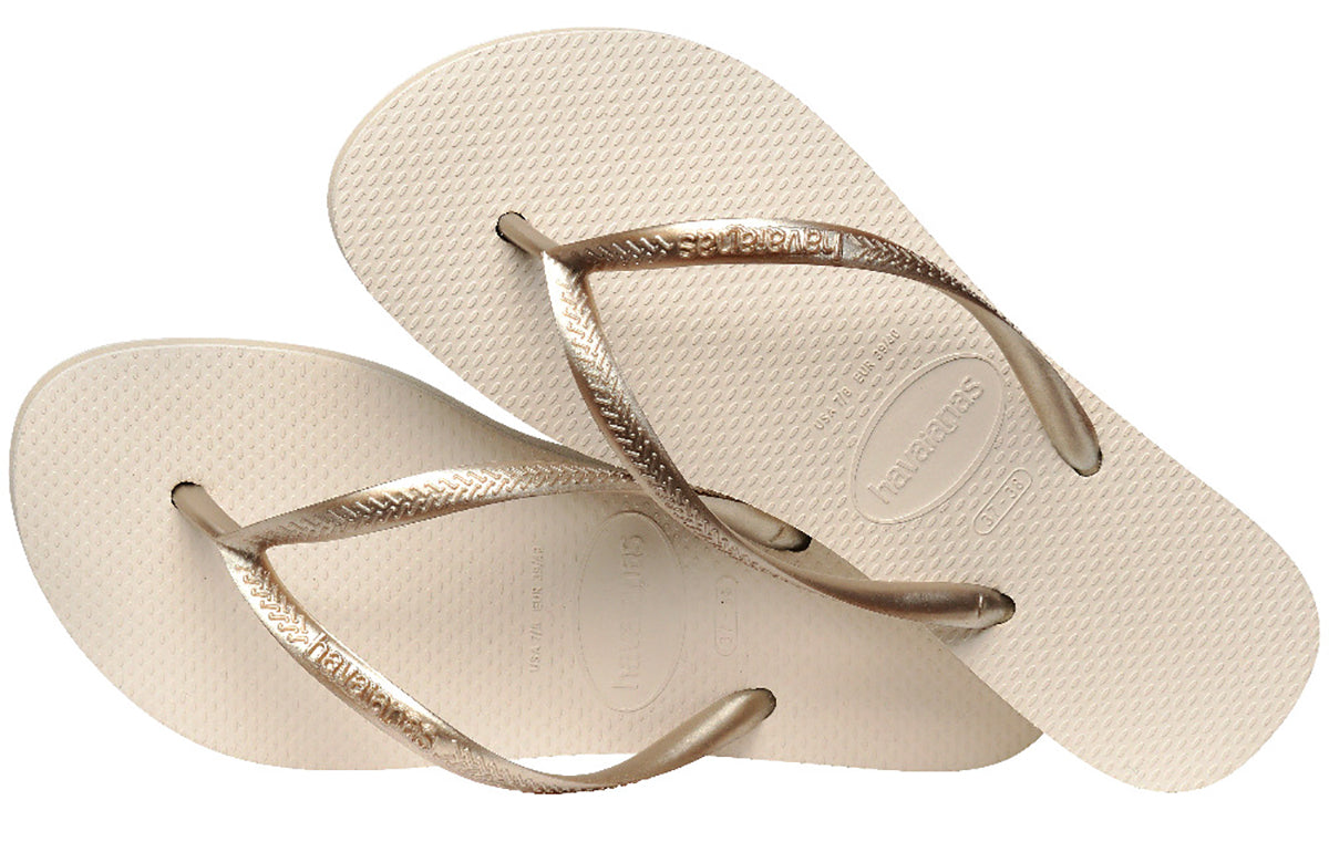 The sandals feature a sleek and minimalistic look, highlighted by an elegant off-white footbed paired with metallic gold-toned straps. The slim, textured straps are embossed with the signature Havaianas branding, adding a touch of sophistication to the classic flip-flop silhouette. The neutral tones ensure these sandals will complement any summer outfit, from casual shorts and t-shirts to flowing beach dresses.