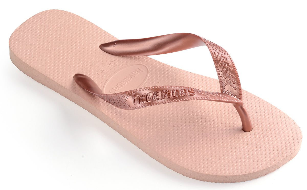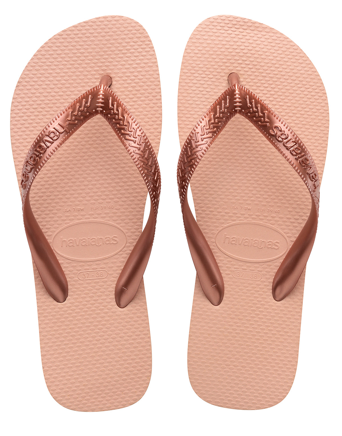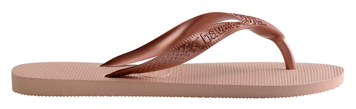 The Top Tiras model boasts a soft, durable rubber construction, ensuring maximum comfort with every step. The lightweight sole features a textured footbed that offers a gentle massaging effect and excellent grip, keeping your feet secure and comfortable throughout the day. The classic toe-post design is paired with sleek metallic rose gold straps, embossed with the Havaianas logo and a subtle pattern for a touch of understated elegance.
