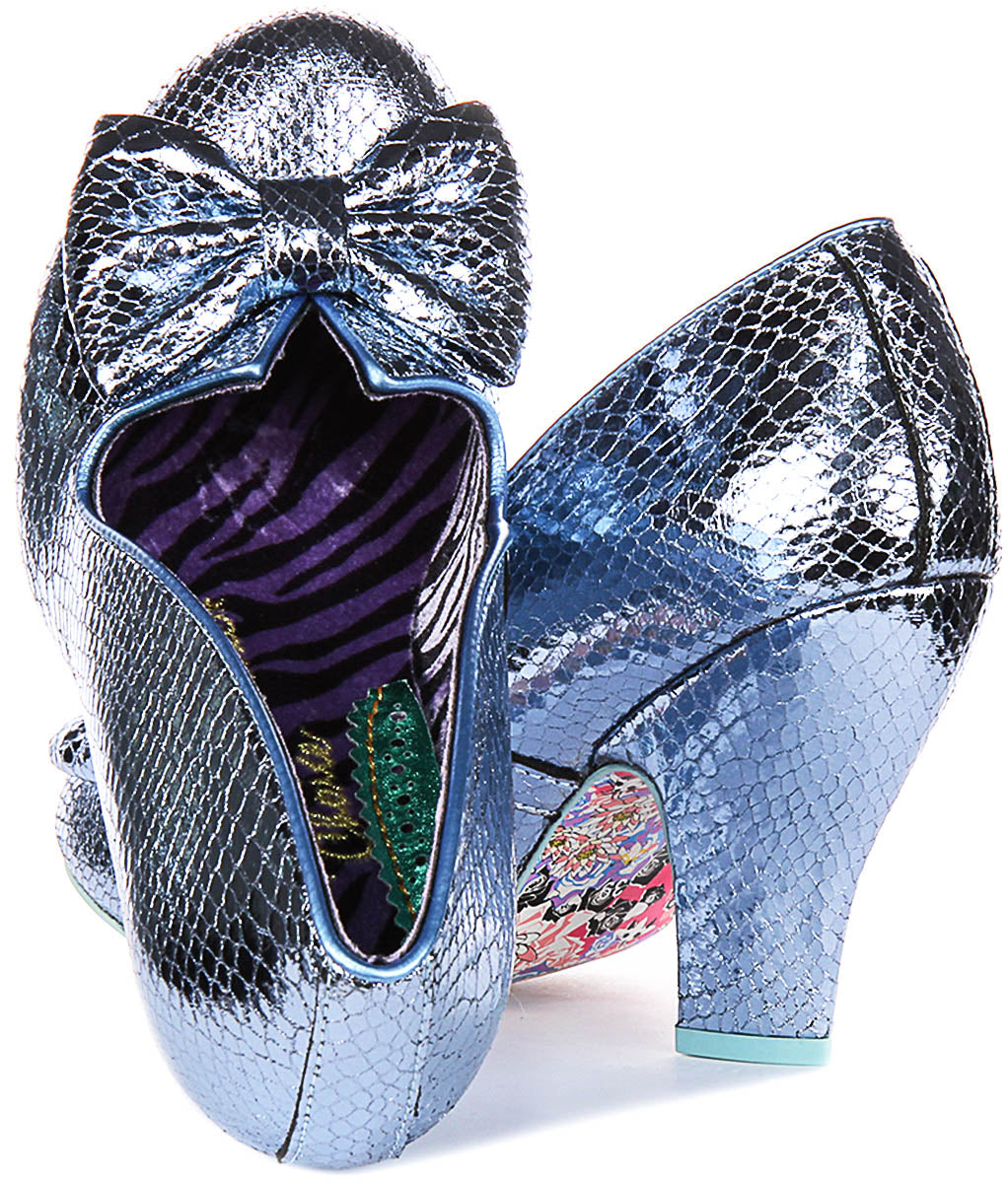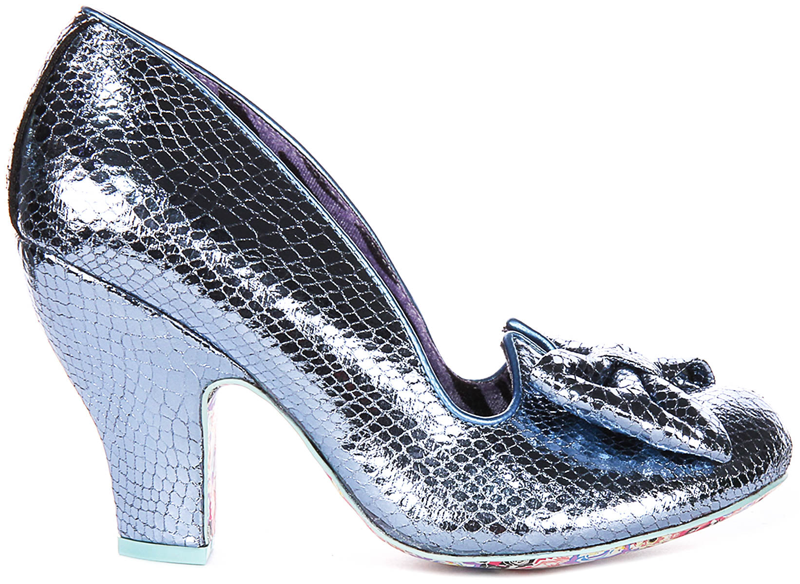 The standout feature of these shoes is their eye-catching outer material, crafted from a striking metallic fabric with a textured, snakeskin-inspired finish. The shimmering blue tone is beautifully complemented by the glossy sheen, making these heels a true showpiece. The front is adorned with an oversized bow, adding a touch of feminine charm and vintage-inspired glamour to the design.