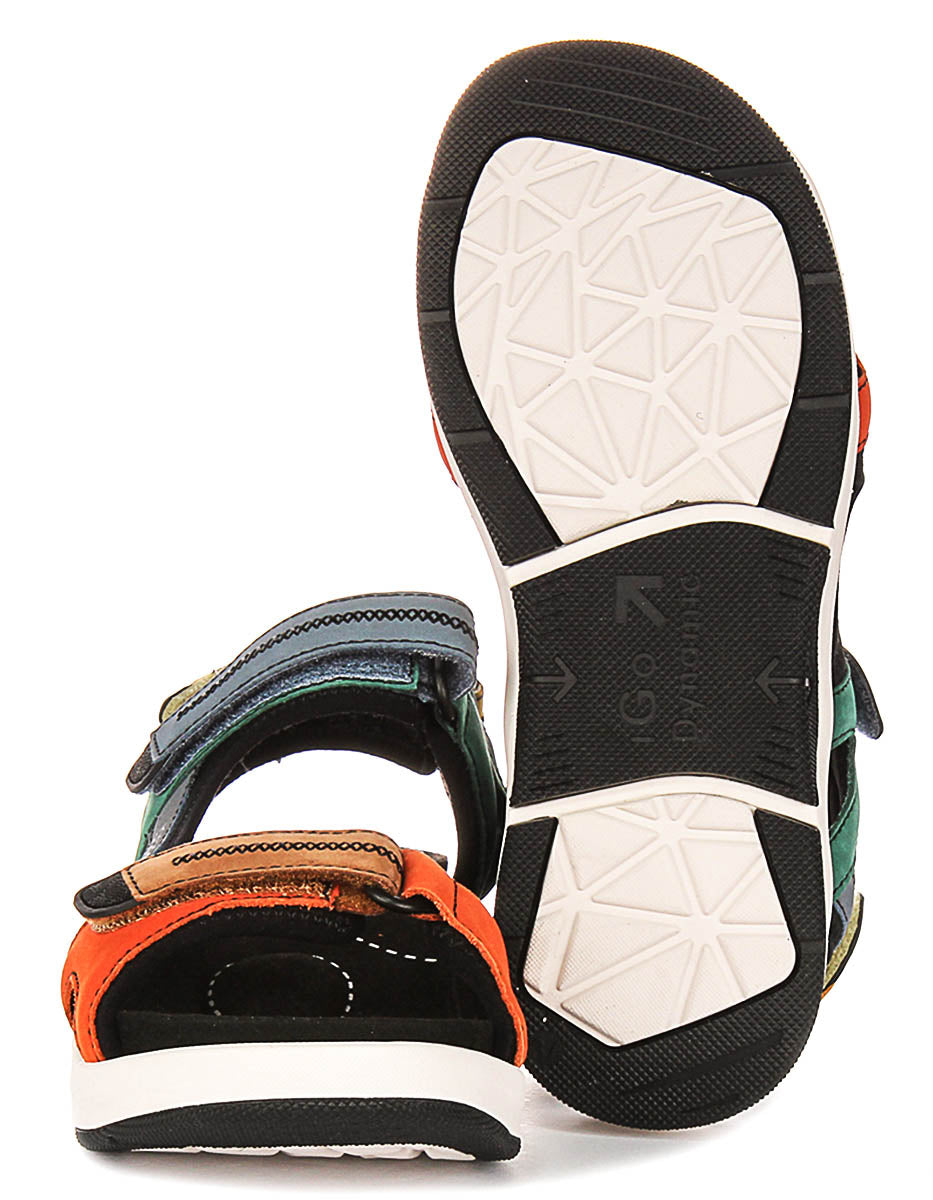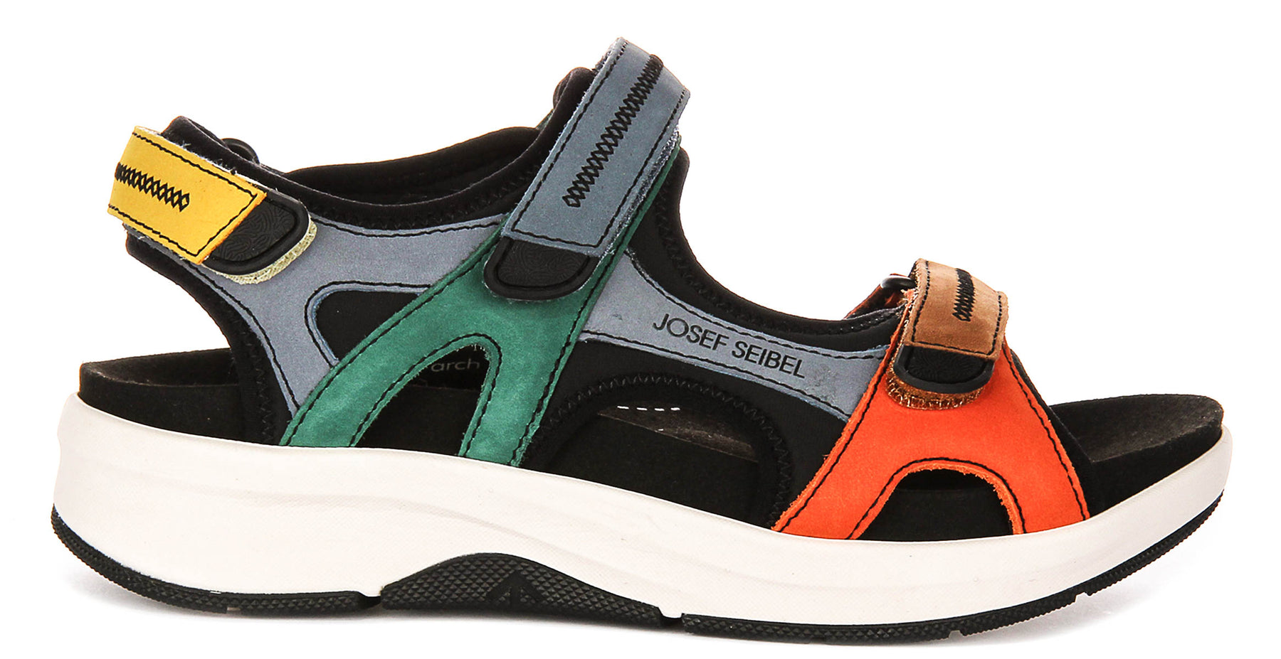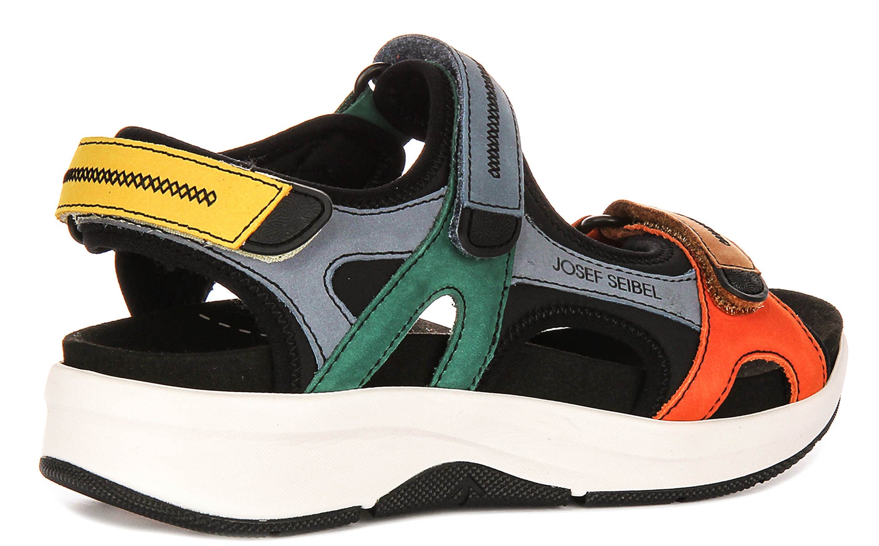 Crafted from high-quality leather, the upper material showcases a vibrant multi-colour design with bold panels of orange, green, blue, brown, and yellow. This playful yet stylish mix of colours adds a contemporary touch to the sandals, making them a standout accessory for sunny days. The Josef Seibel branding is subtly integrated into the design, adding an element of sophistication to the overall look.