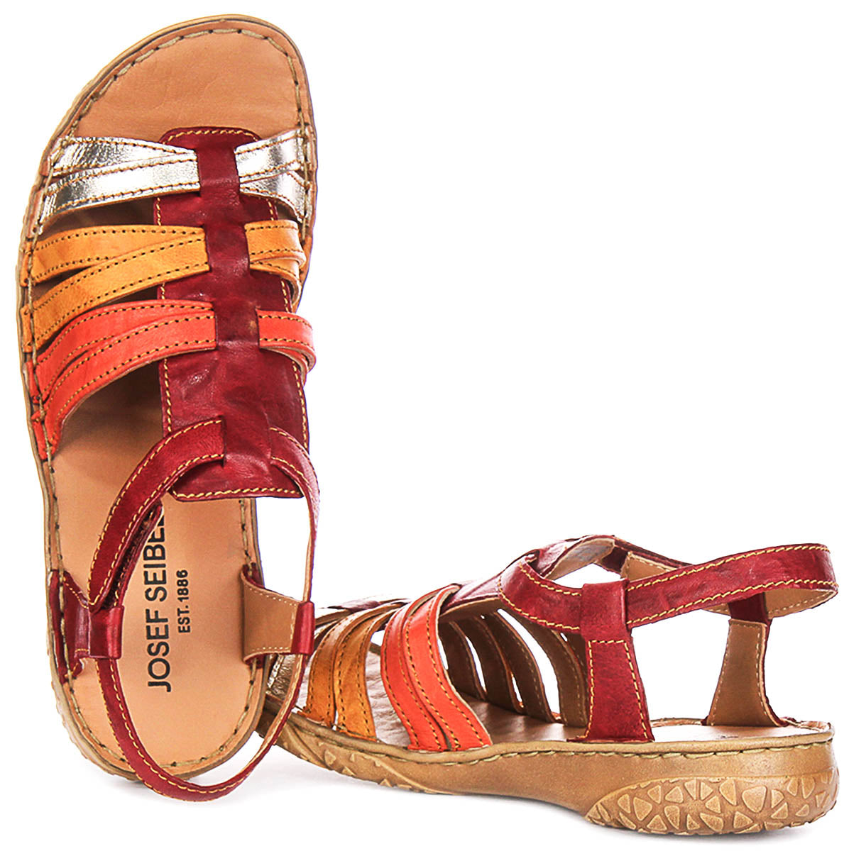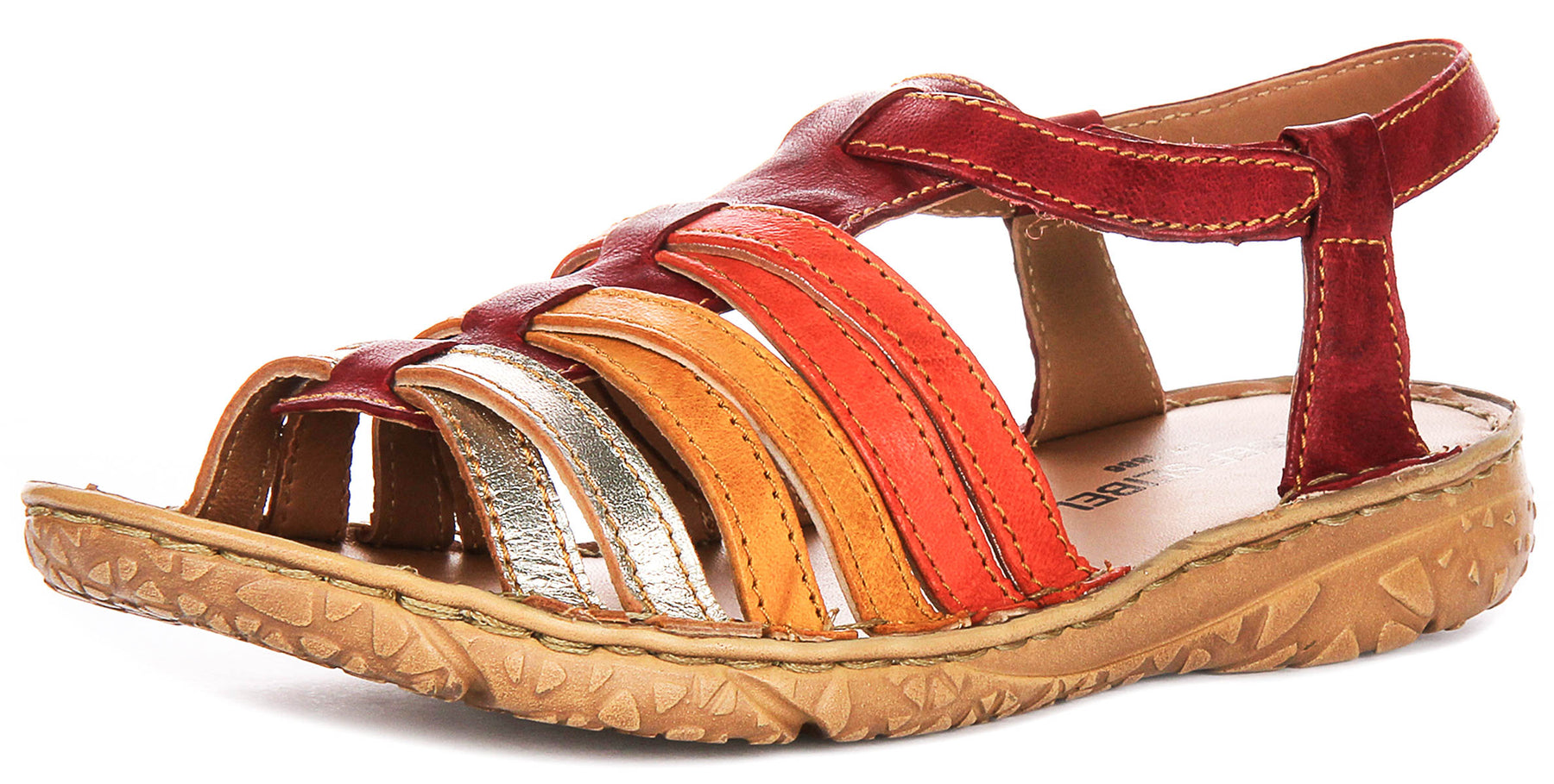 The outer material is premium leather, expertly crafted into multiple straps that provide a secure and breathable fit. The straps come in a stunning combination of rich red, bright orange, warm tan, and a touch of metallic silver, creating an eye-catching and playful colour palette. The detailed stitching adds to the durability and aesthetic appeal, making these sandals stand out with a handcrafted look.