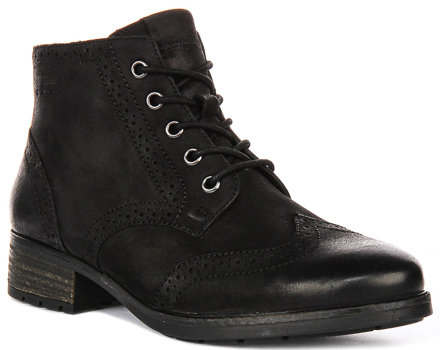 The Josef Seibel Kate 11 Ankle Boots are an ideal choice for the discerning woman seeking a blend of classic aesthetics, contemporary comfort, and enduring quality. Their sophisticated black leather and timeless brogue detailing make them suitable for pairing with anything from tailored trousers to casual denim, ensuring you step out in style and comfort whatever the weather.