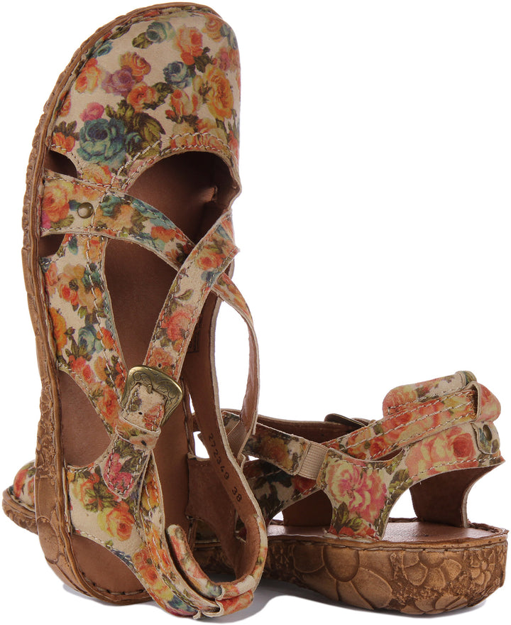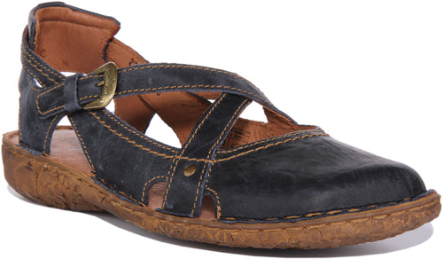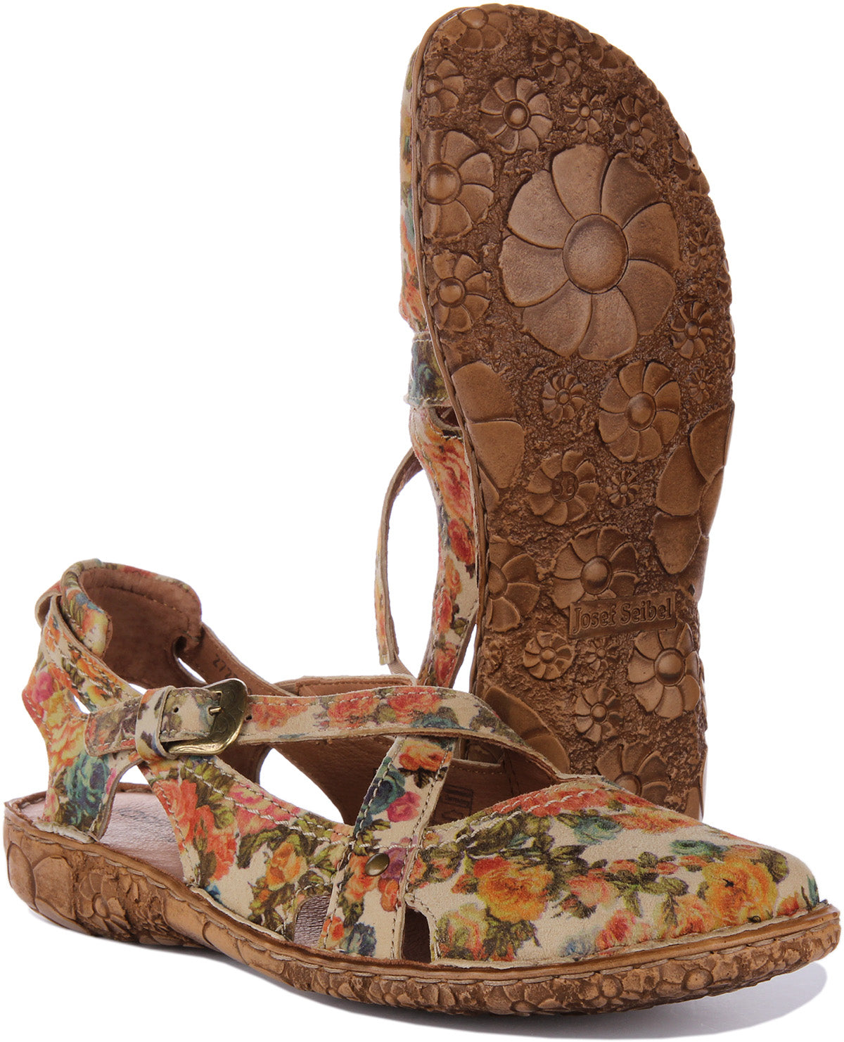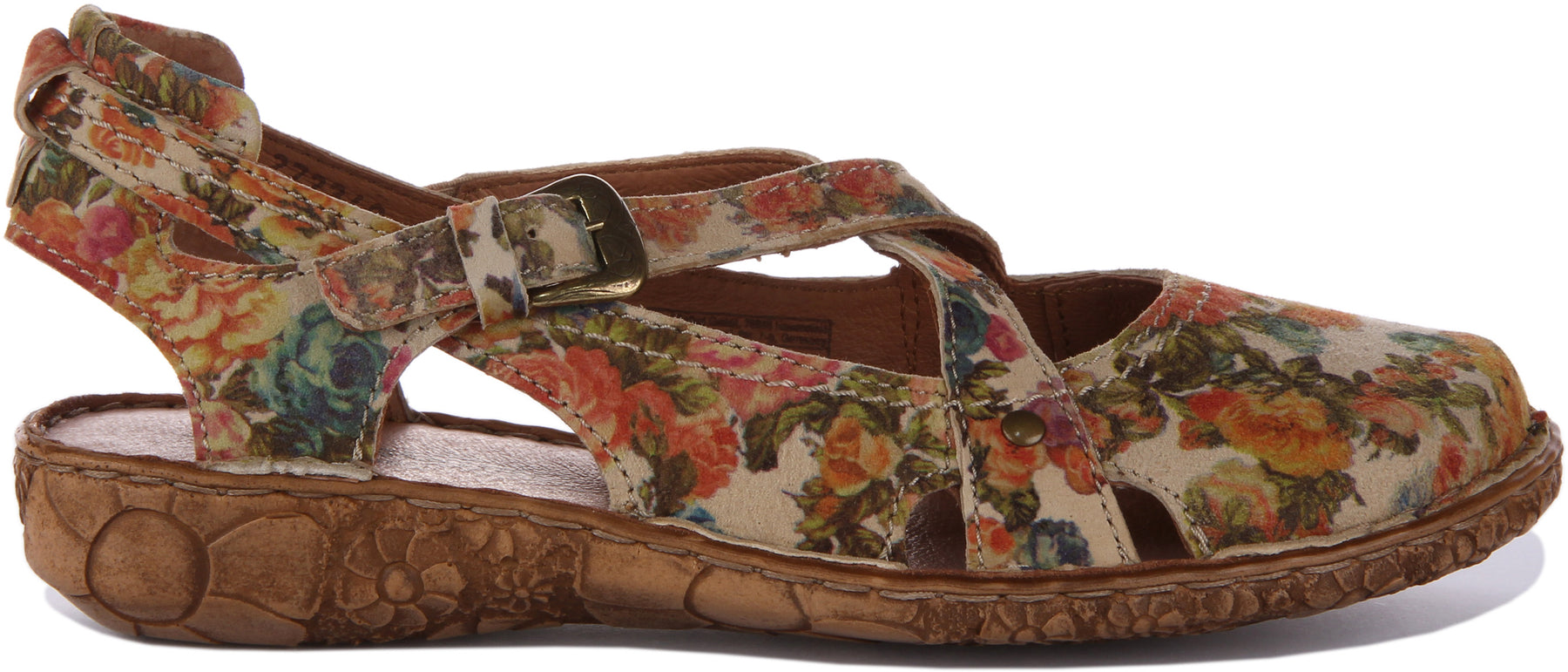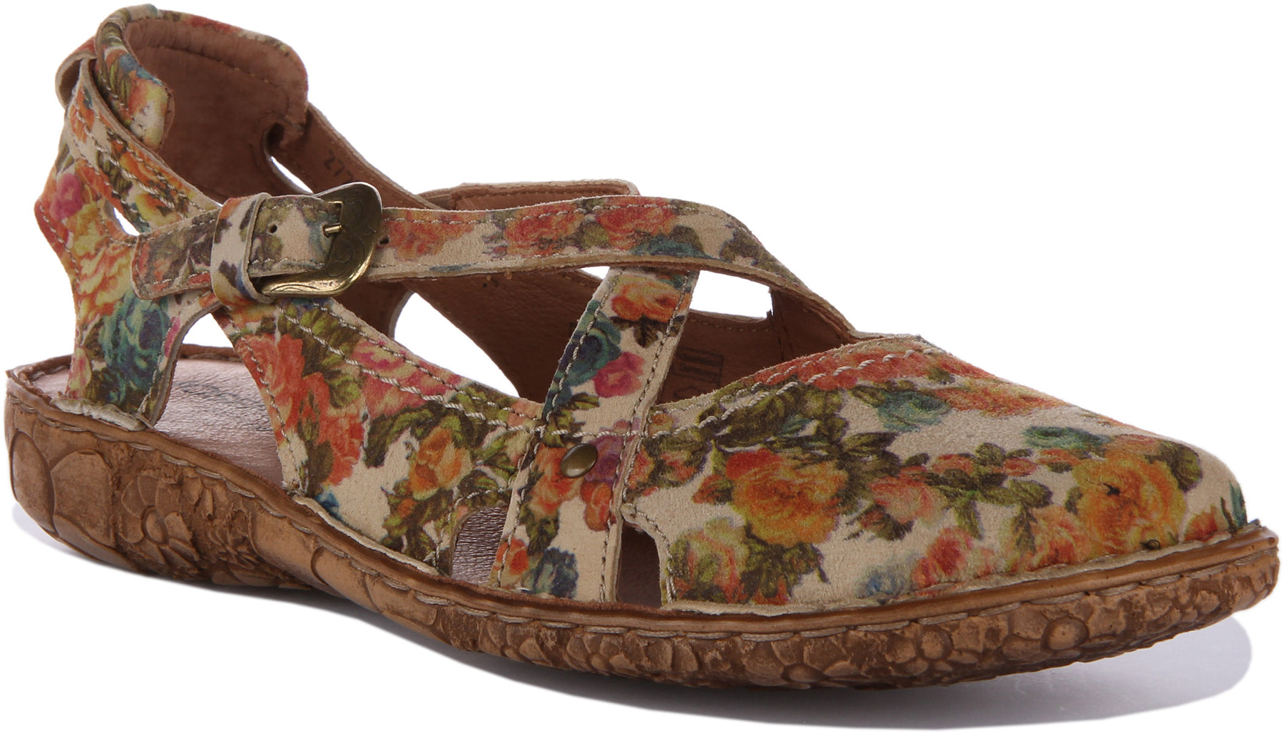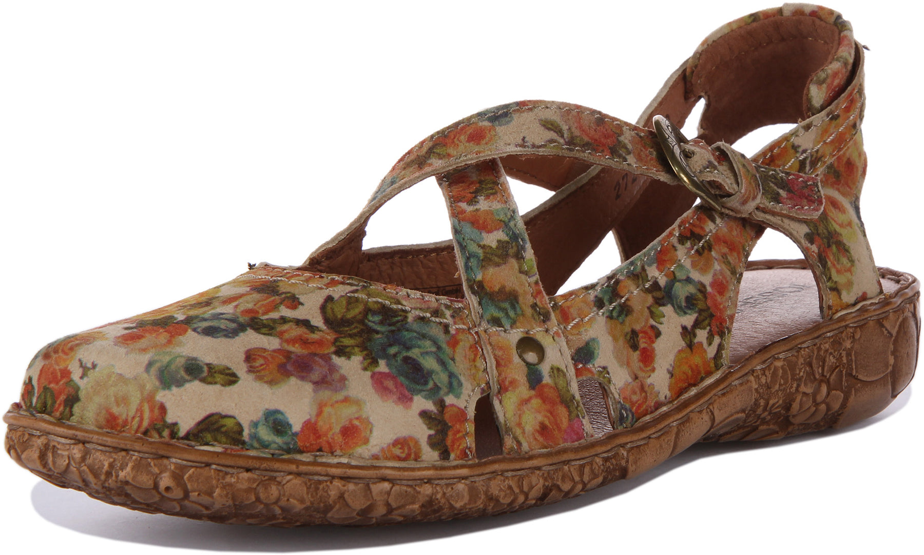 Ladies closed-toe summer sandal featuring pump shoe style and a cut out design to the side, sitting atop the classic Rosalie floral sole unit. This fresh new addition to spring range has a delicate handstitched finish and is crafted in soft supple leathers. It features buckle closure for adjustable and secured fit. The high-strength PU cork outsole with TR thread is ideal for active and fashion-conscious women.