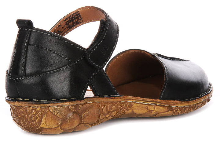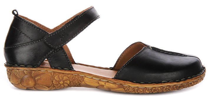 These sandals feature a unique design with a closed-toe front, providing protection and an added level of comfort for all-day wear. The leather straps wrap around the foot, offering a secure fit with a convenient hook-and-loop fastener that ensures easy adjustment and on-and-off access.