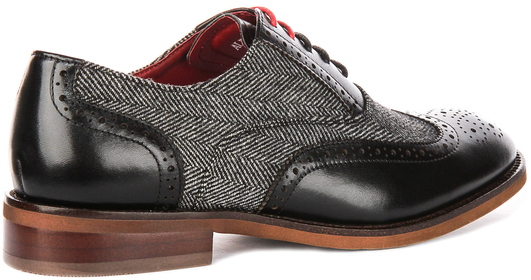 The Albert model features a striking combination of smooth black leather and elegant herringbone-patterned canvas. The outer material is thoughtfully selected, blending premium leather for durability and refined looks, with canvas panels that add a textured, stylish contrast. Traditional brogue detailing, including meticulous perforations along the toe and quarters, further enhances the shoe’s classic appeal, while the carefully crafted wooden-effect sole adds a subtle touch of vintage charm.