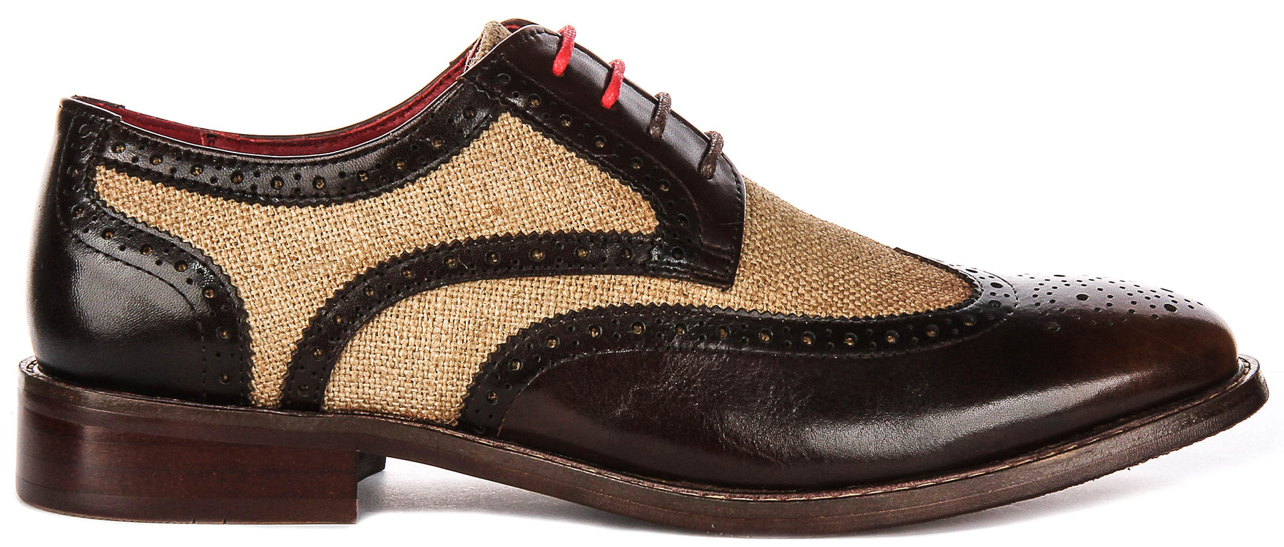 The outer material of these shoes features a premium combination of smooth leather and durable canvas. The rich, dark brown leather panels are beautifully complemented by the natural beige canvas, creating a unique two-tone effect that catches the eye. Decorative brogue detailing and traditional wingtip design further enhance the shoe’s timeless appeal, while the contrasting red laces add a subtle yet stylish pop of colour.