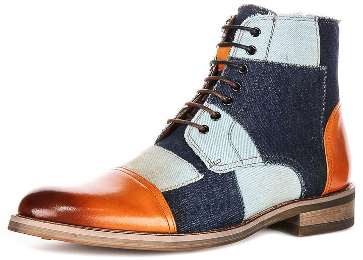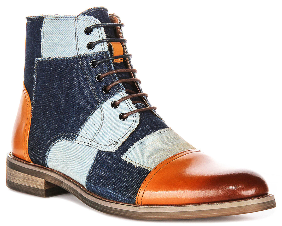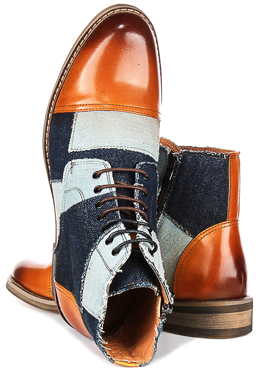 The unique upper material immediately catches the eye, featuring a distinctive combination of leather and canvas. The main body of the boot showcases a patchwork design using varying shades of denim canvas, creating a visually interesting and textured look. This denim patchwork gives the boots a casual yet sophisticated aesthetic, perfect for adding character to any outfit.
