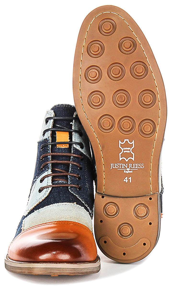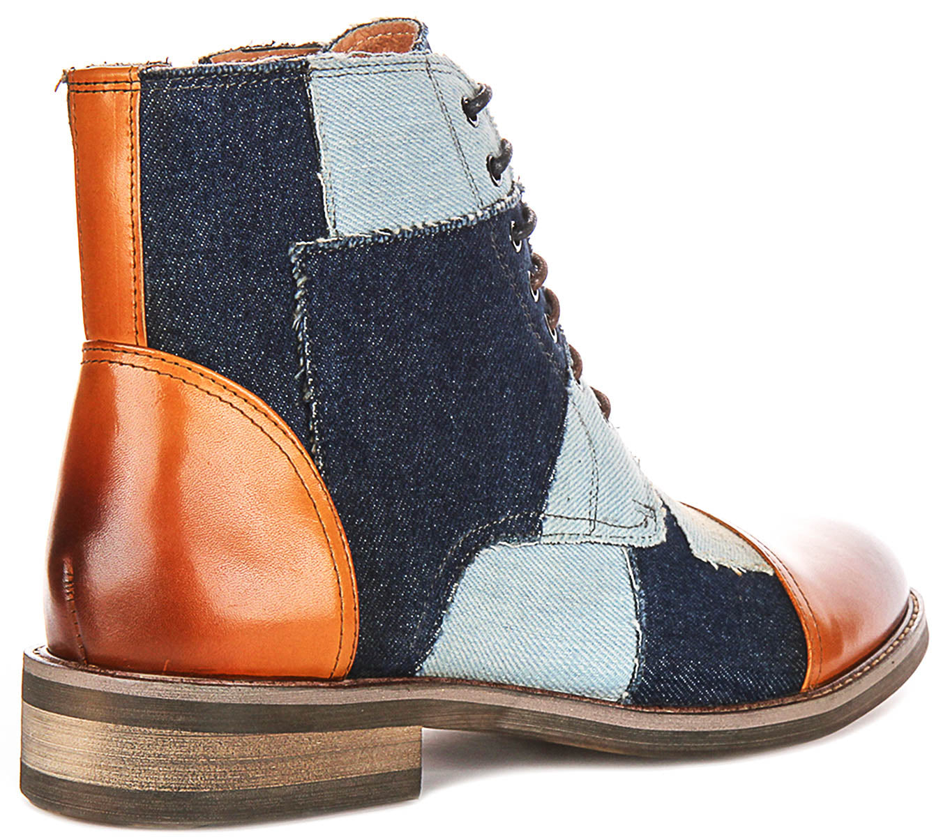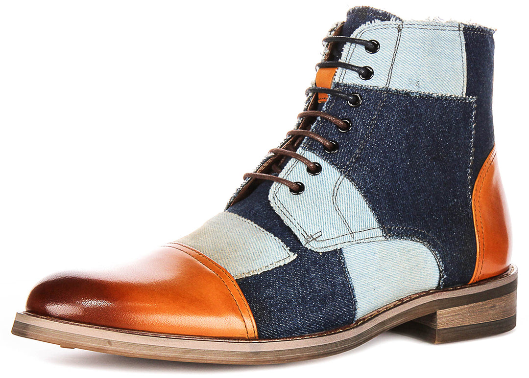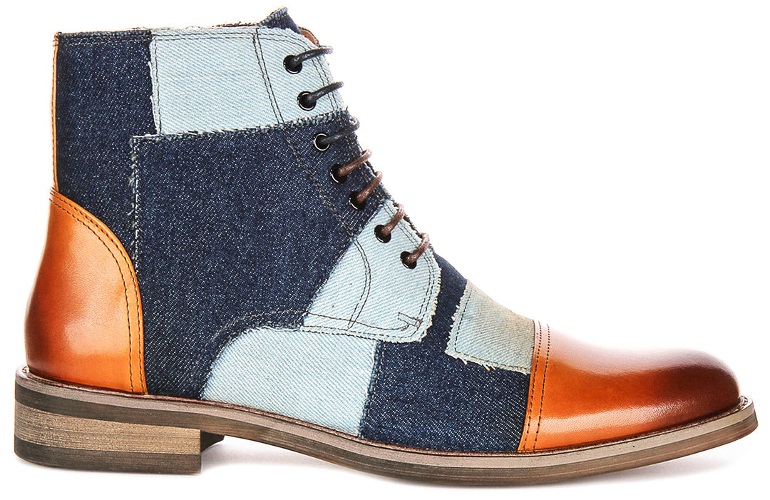 Contrasting beautifully with the denim, the toe cap, heel and detailing around the ankle are crafted from smooth, tan leather. This leather not only provides durability and structure to the boot but also adds a refined touch of classic footwear design. The rich, warm tone of the leather complements the cool denim tones perfectly, resulting in a balanced and stylish colour combination.