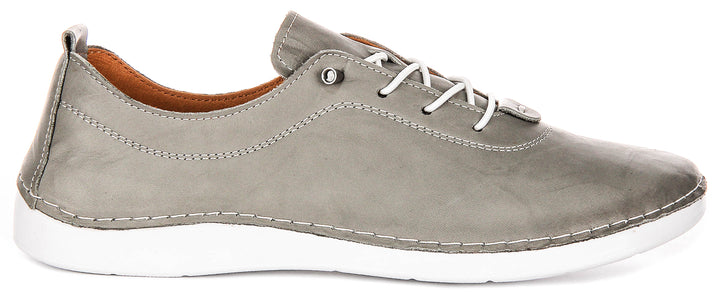The Harley trainers feature a classic lace-up design with contrasting white laces, allowing for an adjustable and secure fit. Delicate stitching details accent the leather upper, adding a touch of refined style. The trainers are finished with a clean white sole, providing a modern and sporty contrast to the grey leather.
