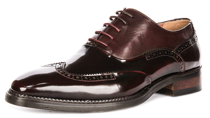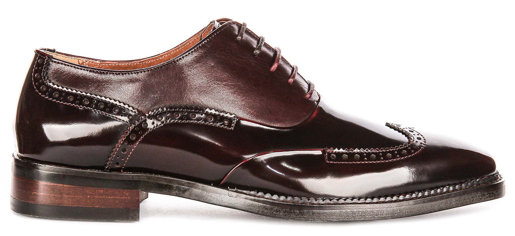 The shoes feature a classic wingtip brogue design, adding a touch of elegance with intricate perforations and detailing. The rich, dark finish enhances their versatility, allowing them to be paired seamlessly with both business attire and formal evening wear. The lustrous leather not only gives a sleek look but also promises long-lasting wear and comfort.