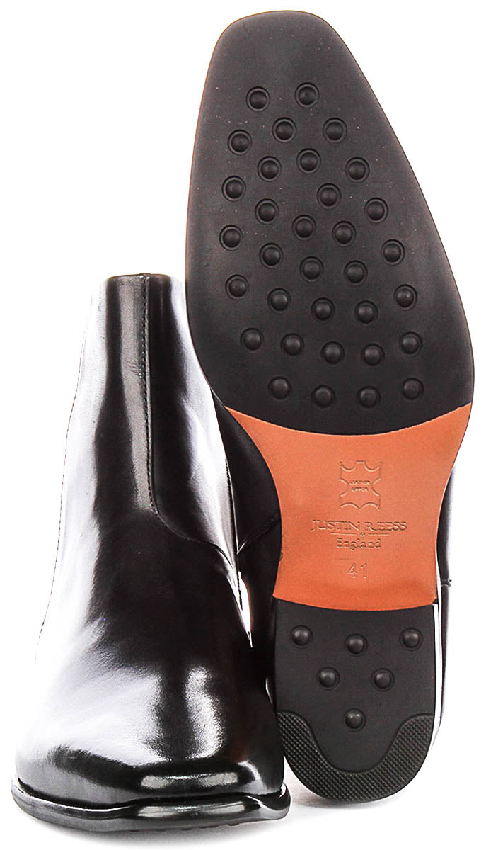 The sole is thoughtfully designed for both style and practicality. It features a sturdy, low block heel that provides a subtle lift and stable foundation. The robust outsole incorporates a rubberised forepart and heel for enhanced grip and durability, while the midsection reveals a branded leather waist, showcasing the authentic Justinreess England mark of quality. These mens ankle boots are a truly versatile and elegant choice.
