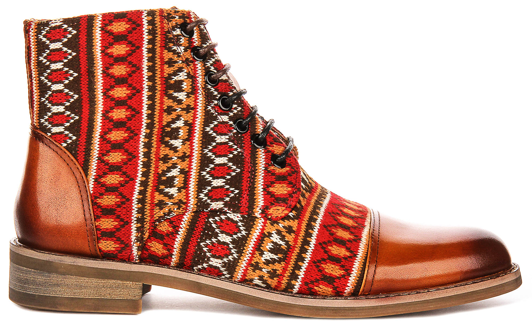 Step up your footwear game with the Justinreess England Juan Men’s Leather Ankle Boots, a perfect blend of modern style and traditional craftsmanship. These eye-catching ankle boots are designed for the discerning gentleman who values individuality and quality. The Juan model stands out with its striking patterned textile panels, beautifully complemented by smooth, rich tan leather overlays on the toe, heel, and lace area.