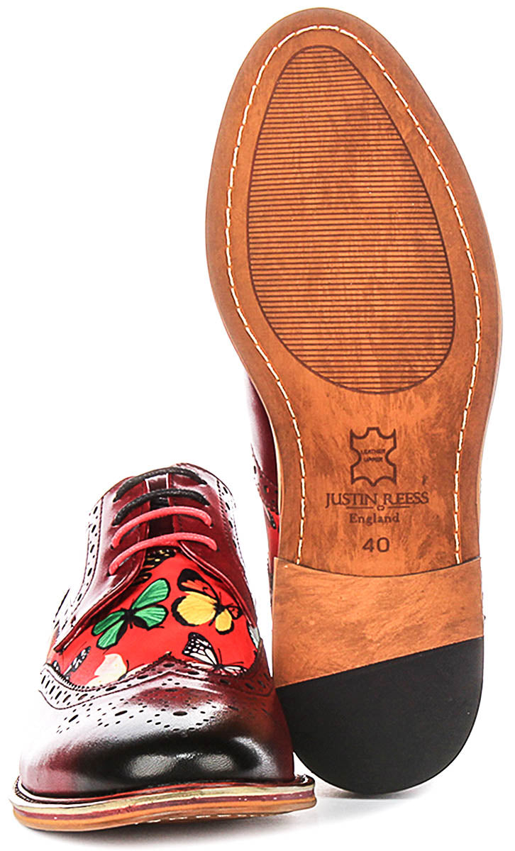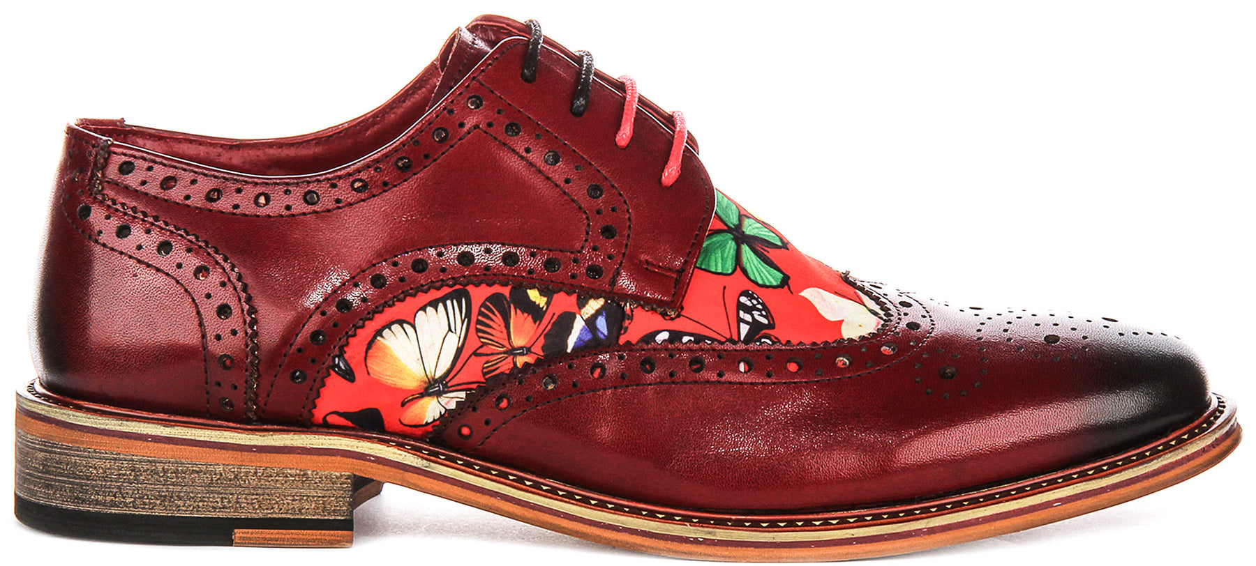 The true highlight of the Julius shoe lies in its unique textile insert, which features a vibrant and artistic multi-coloured butterfly pattern set against a bright red background. This playful yet refined design transforms the classic silhouette into a statement piece, ensuring you stand out from the crowd. The intricate details of the butterflies, in shades of yellow, green, blue, and white, add an unexpected pop of colour and personality.