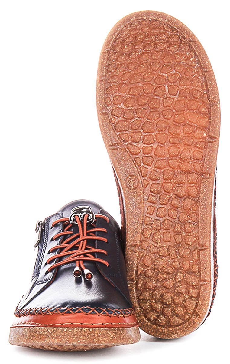The Kenzie shoes feature a sophisticated navy blue leather upper, providing a sleek and versatile foundation. This deep hue is beautifully complemented by a rich reddish-brown, almost tan, leather trim that runs along the base of the upper. This contrasting colour also extends to the elasticated laces and the soft inner lining, creating a cohesive and attractive palette.