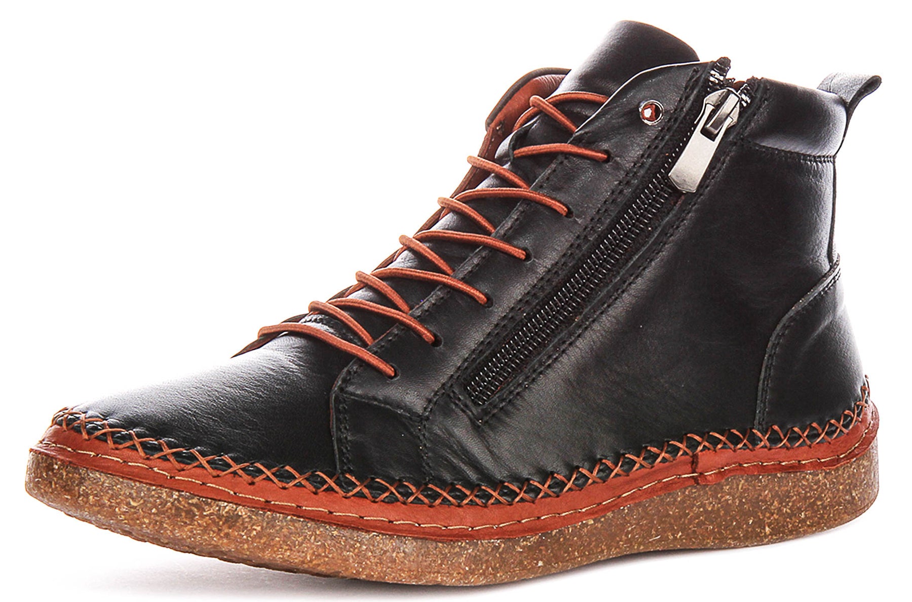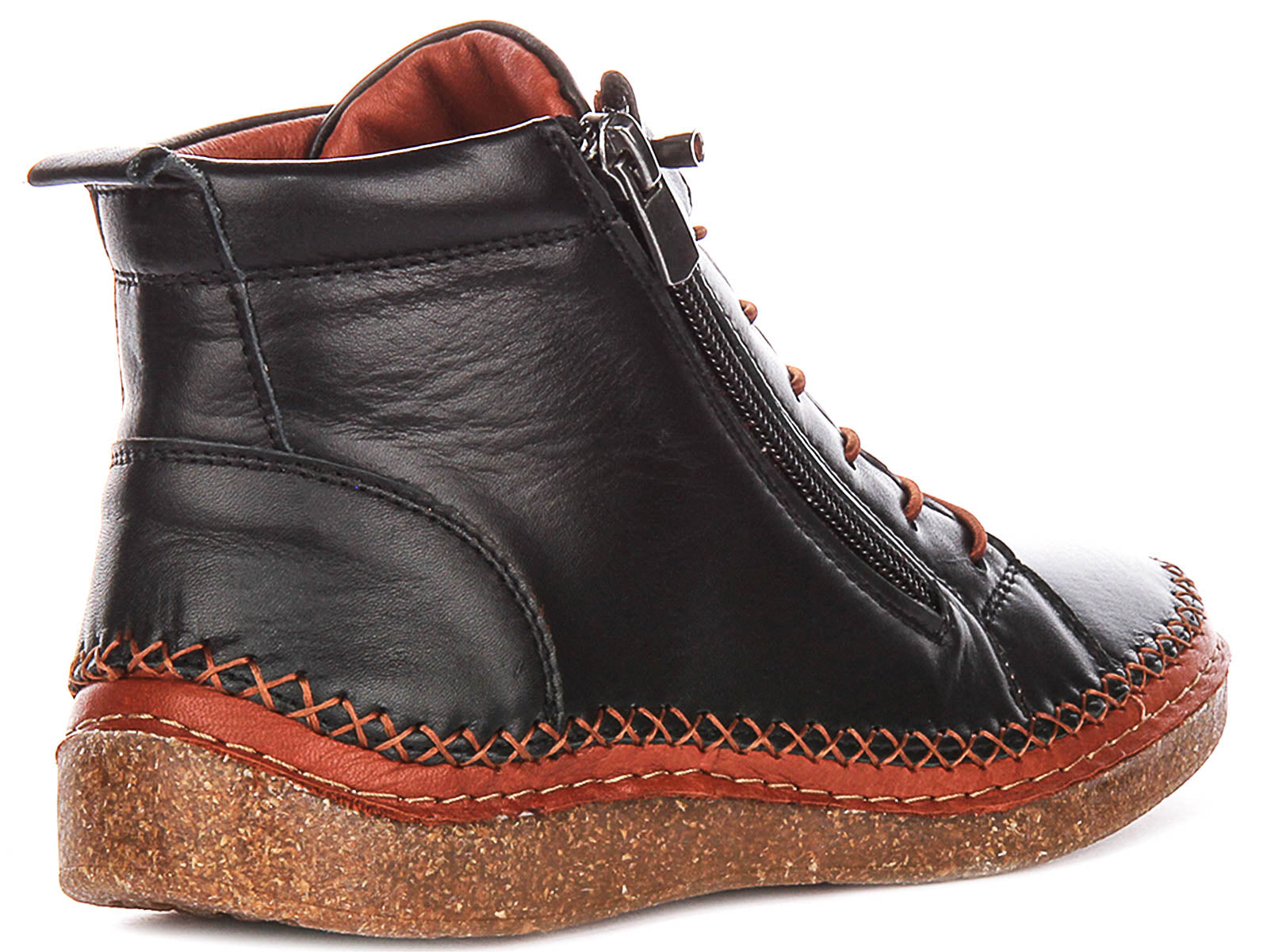 A standout feature is the bold, hand-stitched detailing in a vibrant rust shade, creating an eye-catching border where the upper meets the sole. This intricate cross-stitch design lends a bespoke, artisanal touch to the Kylie boot. The chunky sole, with its natural, textured appearance reminiscent of cork, provides excellent support and a casual aesthetic, while the robust rubber tread ensures reliable grip on various surfaces.