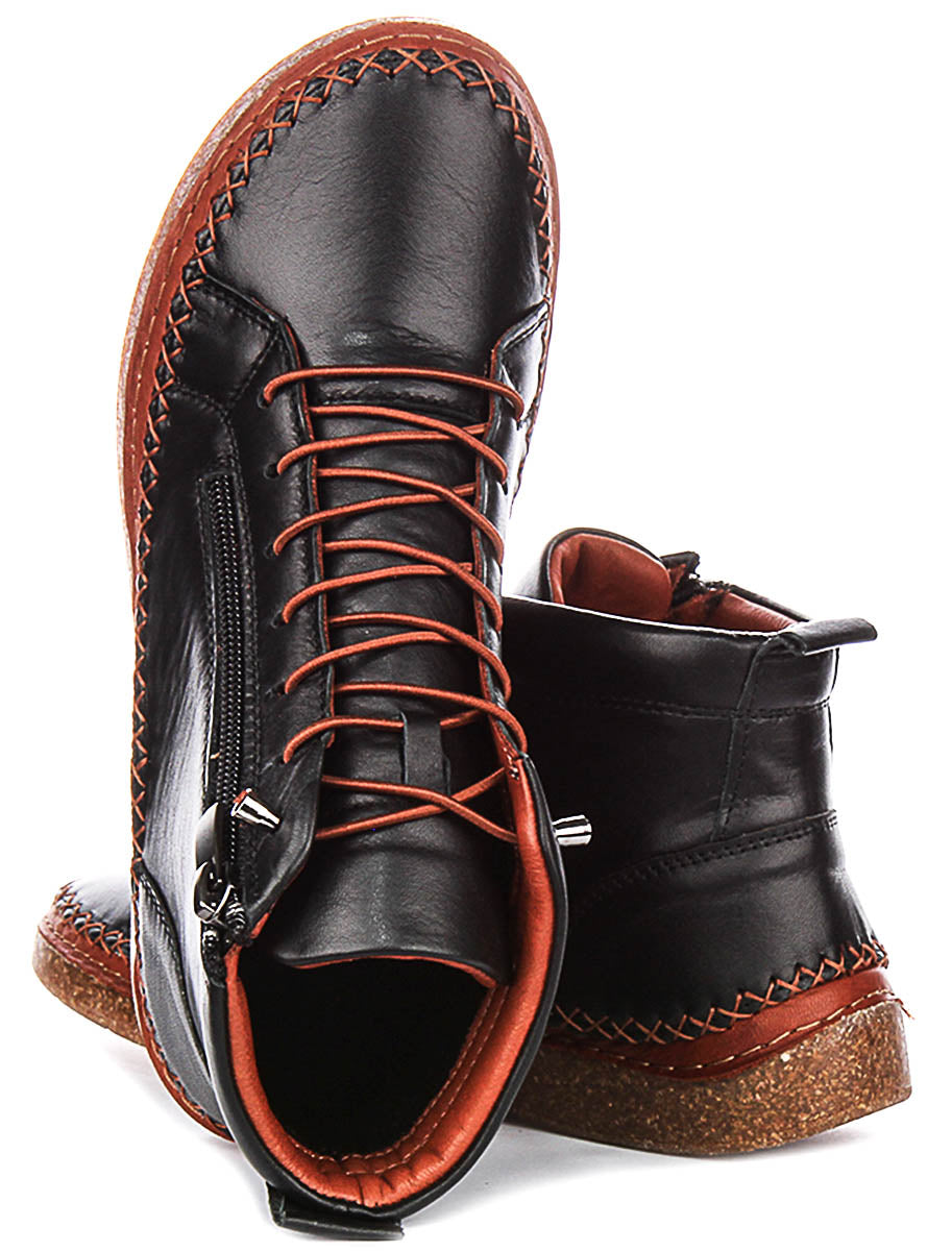Designed for both style and convenience, the Kylie boots feature a practical dual-closure system. The front boasts traditional lacing with sturdy, rust-coloured laces, allowing for an adjustable and secure fit tailored to your comfort. Additionally, a full-length, silver-toned side zip offers effortless donning and doffing. A subtle pull tab at the heel further aids in slipping them on with ease.