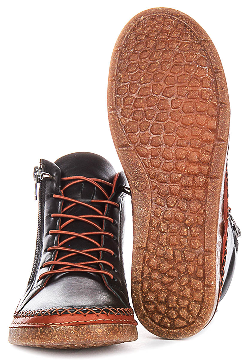 The interior is lined with a comfortable, soft material, matching the warm rust tones of the external accents, ensuring a cosy feel for all-day wear. Whether you're heading out for a leisurely stroll, a shopping trip, or simply enjoying a casual day out, these Justinreess England Kylie ankle boots are an ideal choice, offering comfort, durability, and undeniable style. They effortlessly pair with jeans, trousers, or skirts, making them a versatile addition to any woman's footwear collection.