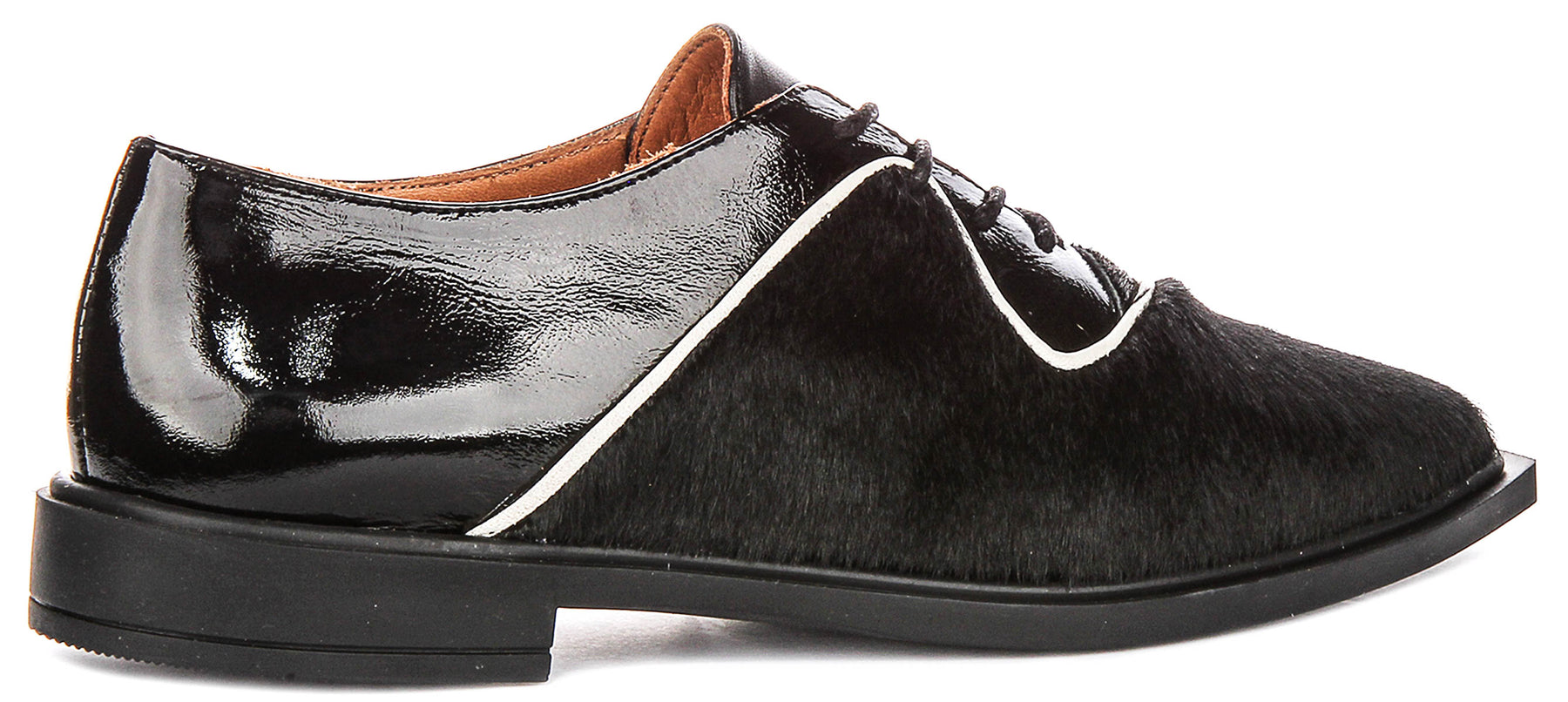 Crafted from premium leather, the Maisie shoes showcase a captivating combination of textures. The main body of the upper features luxurious black pony hair, offering a plush, tactile finish that immediately catches the eye. This is beautifully contrasted with sleek, high-shine black patent leather adorning the heel counter and eyelet sections, providing a polished and elegant counterpoint to the more natural texture.