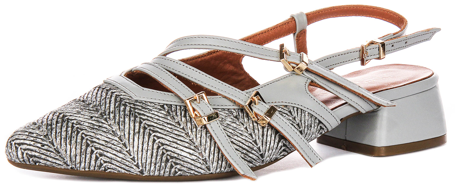 Set upon a low, block heel in a matching light grey, these shoes provide a comfortable lift that is practical for everyday wear. The pointed toe shape adds a classic and elegant silhouette to the overall design. The inner lining appears to be a contrasting tan colour, which could indicate a comfortable and perhaps breathable inner material. These Nellie shoes are a fashionable and comfortable choice, ideal for adding a touch of contemporary flair to a variety of outfits.