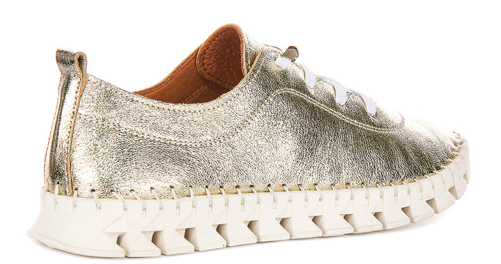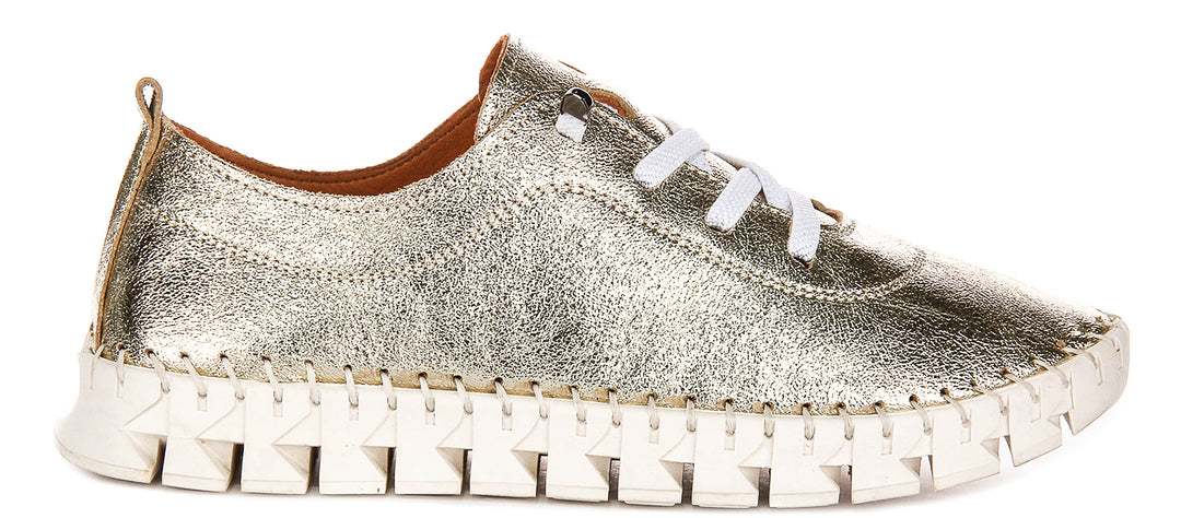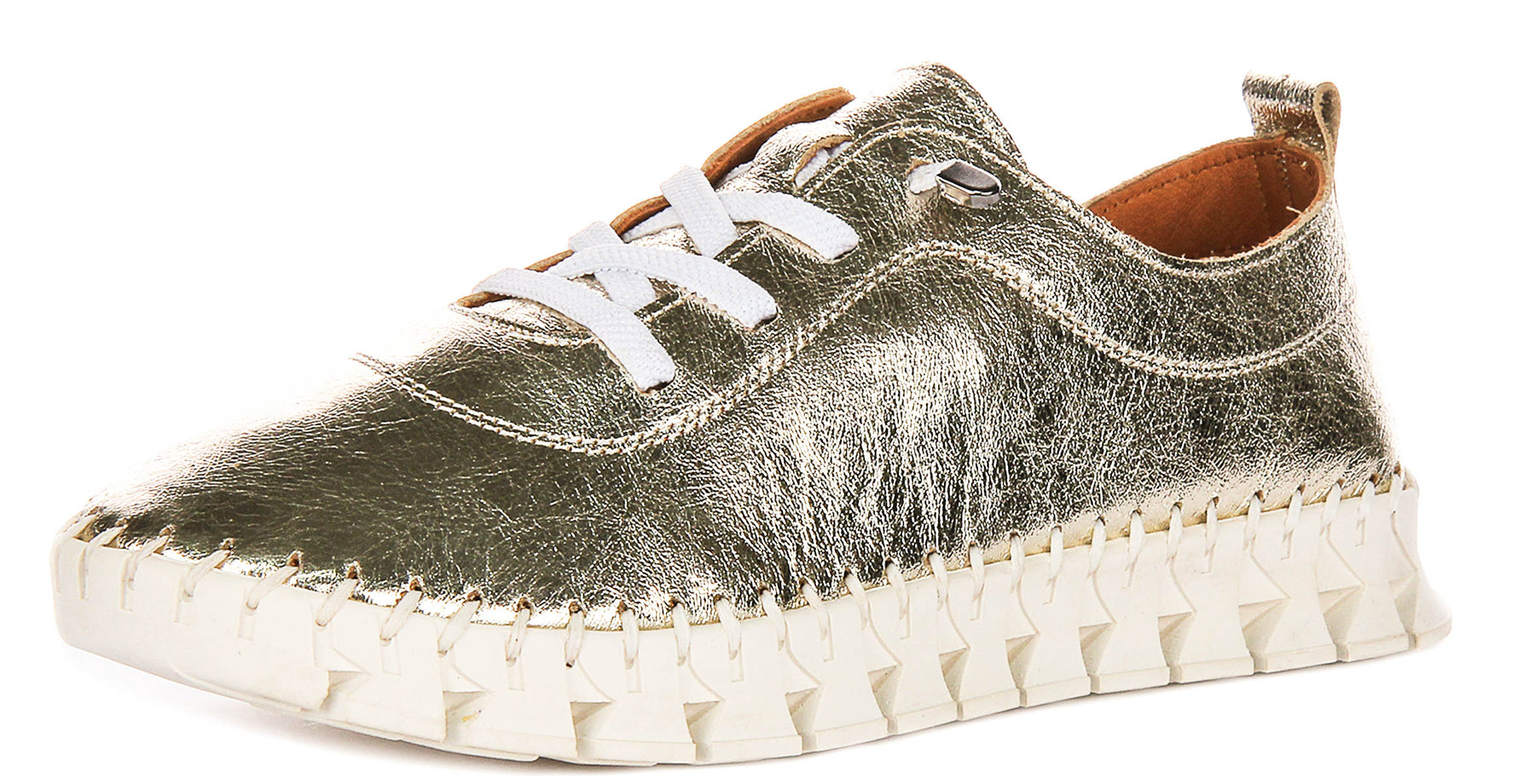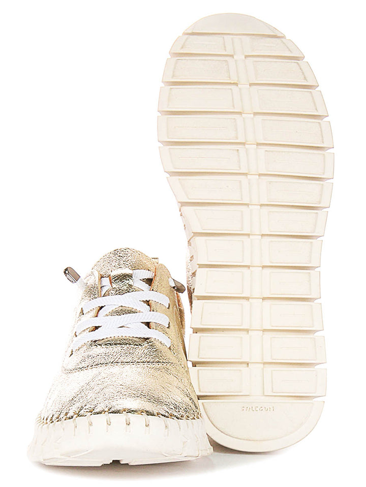 The Rexy shoes come in a metallic gold hue that pairs beautifully with the clean white laces and sole. This eye-catching contrast enhances their contemporary appeal while ensuring they can be easily styled with a variety of outfits. The pull-tab at the back adds convenience, allowing you to slip them on and off effortlessly.