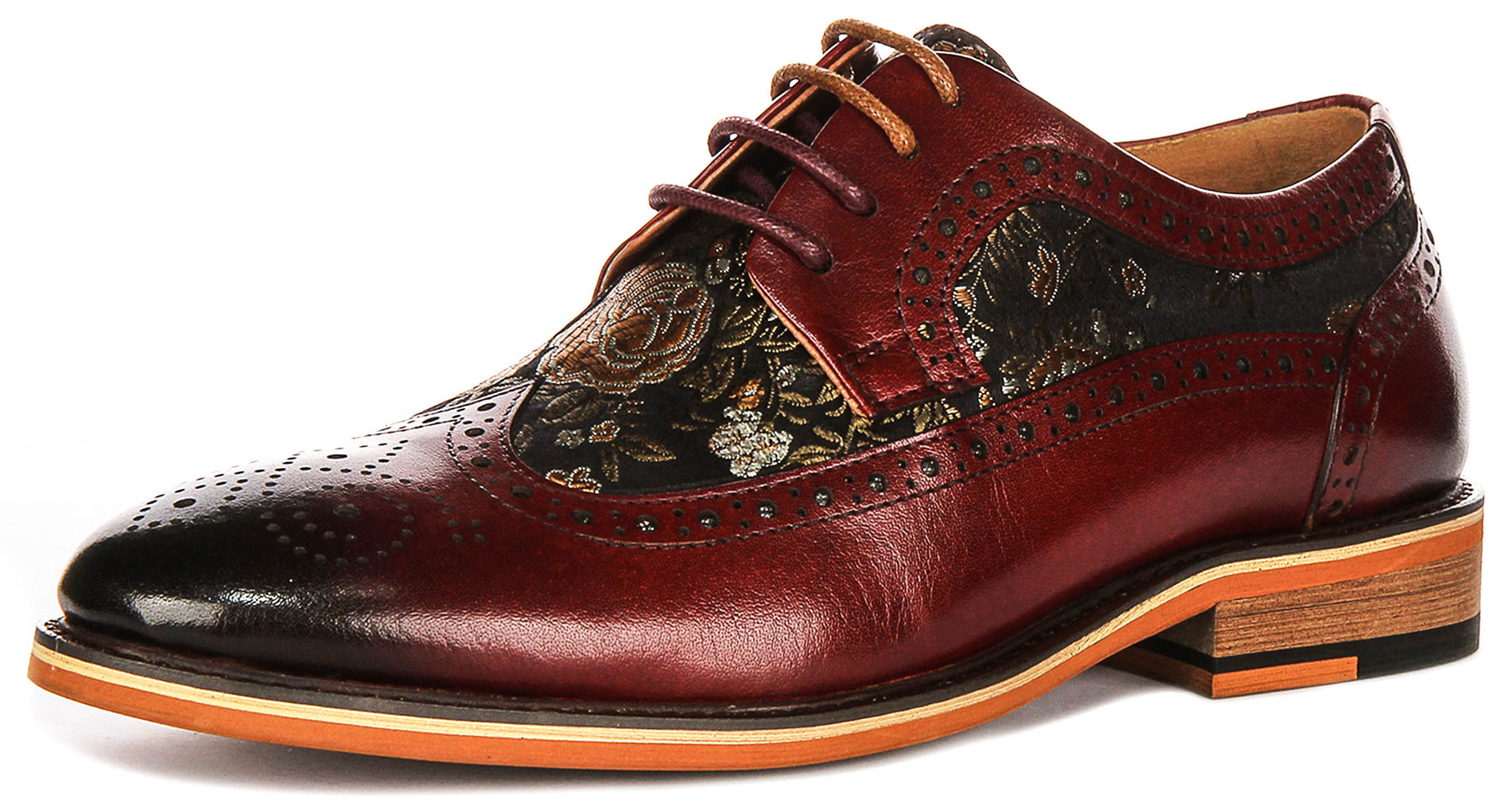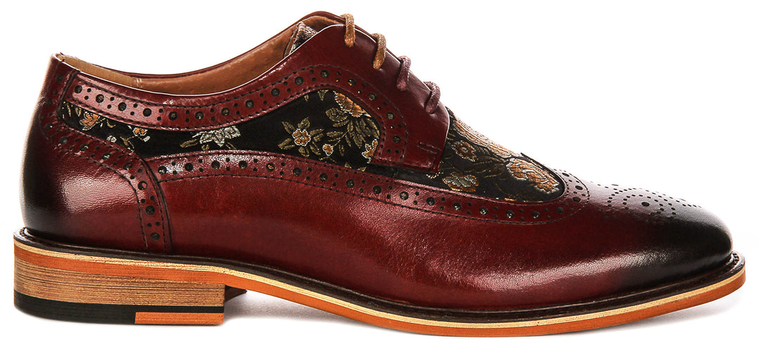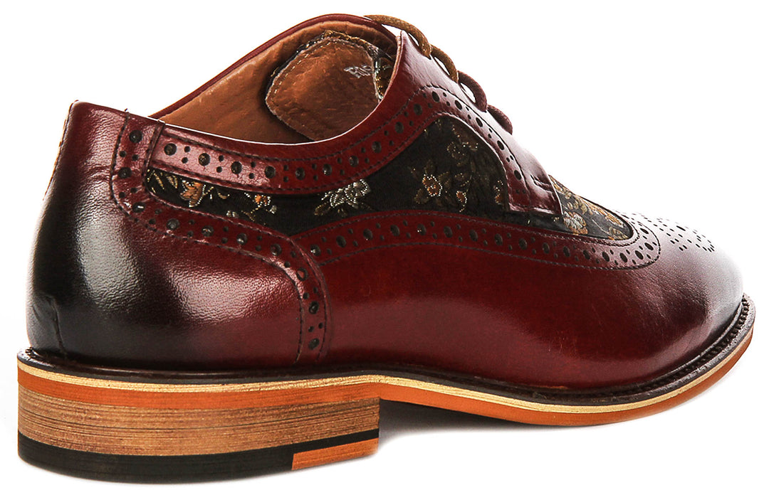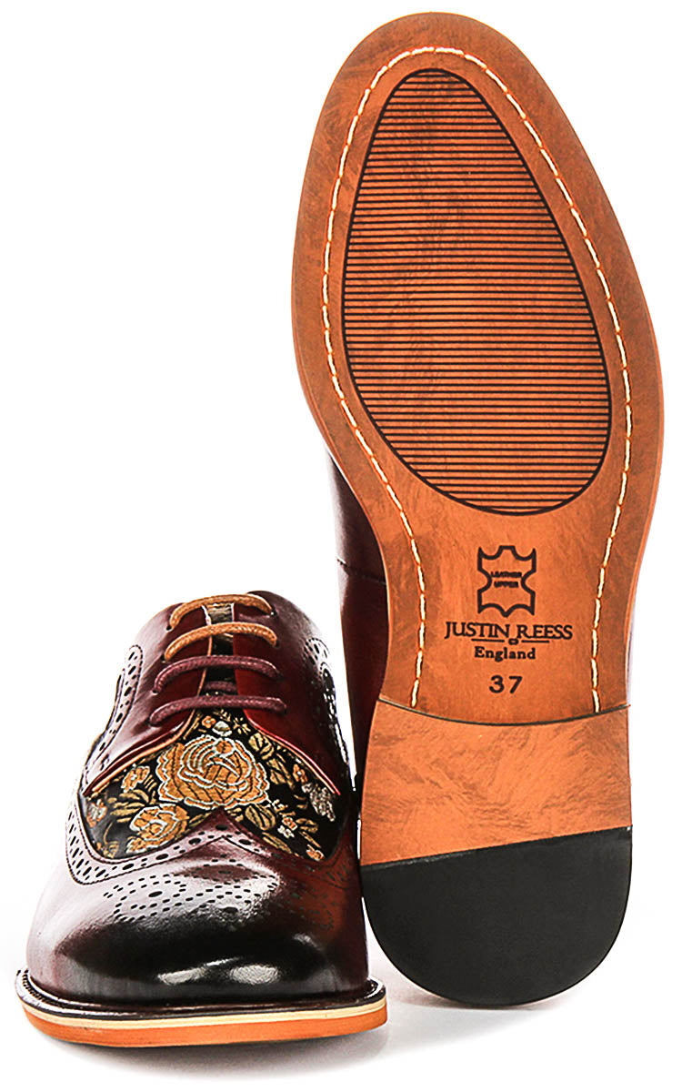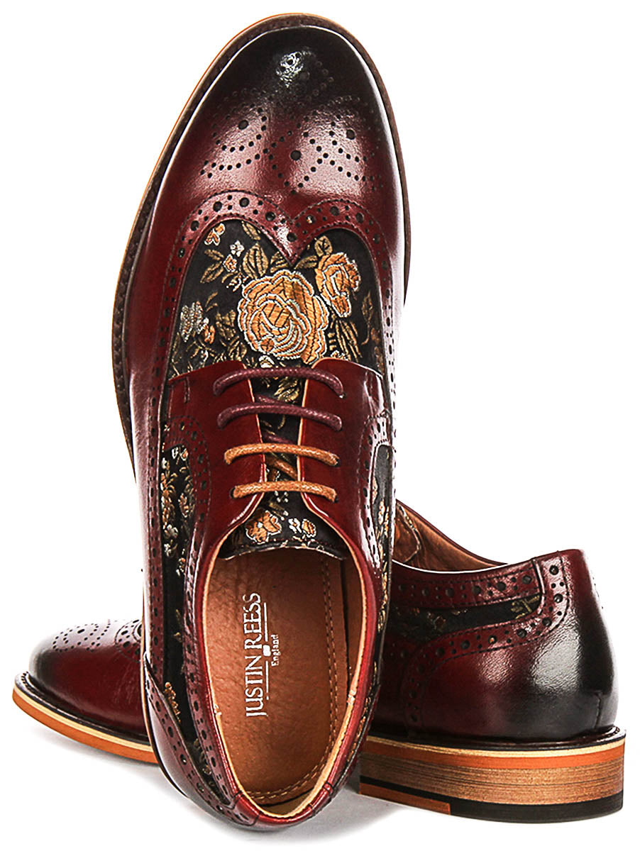 Adding to their distinctive charm, the Ross W shoes feature a unique floral fabric panel on the side. This eye-catching detail injects a touch of femininity and artistry into the classic brogue style. The intricate brogue detailing, with decorative perforations along the edges, further enhances the sophisticated aesthetic of these shoes, showcasing the craftsmanship that Justinreess England is known for.