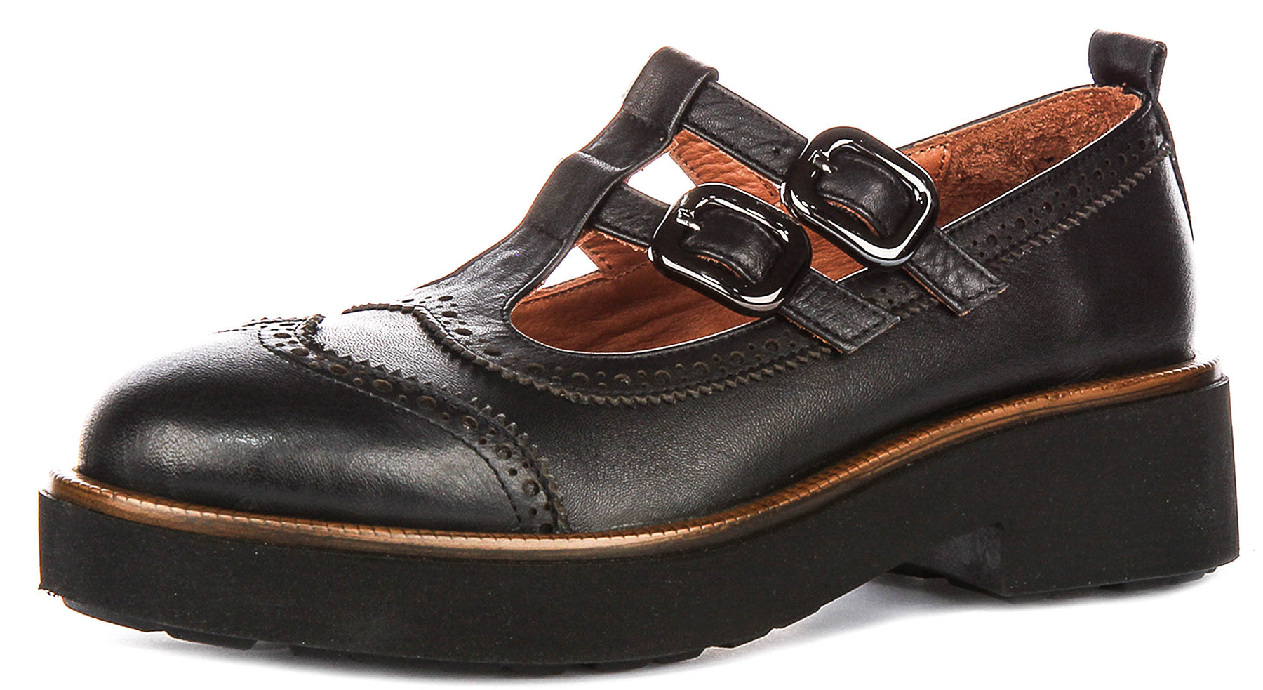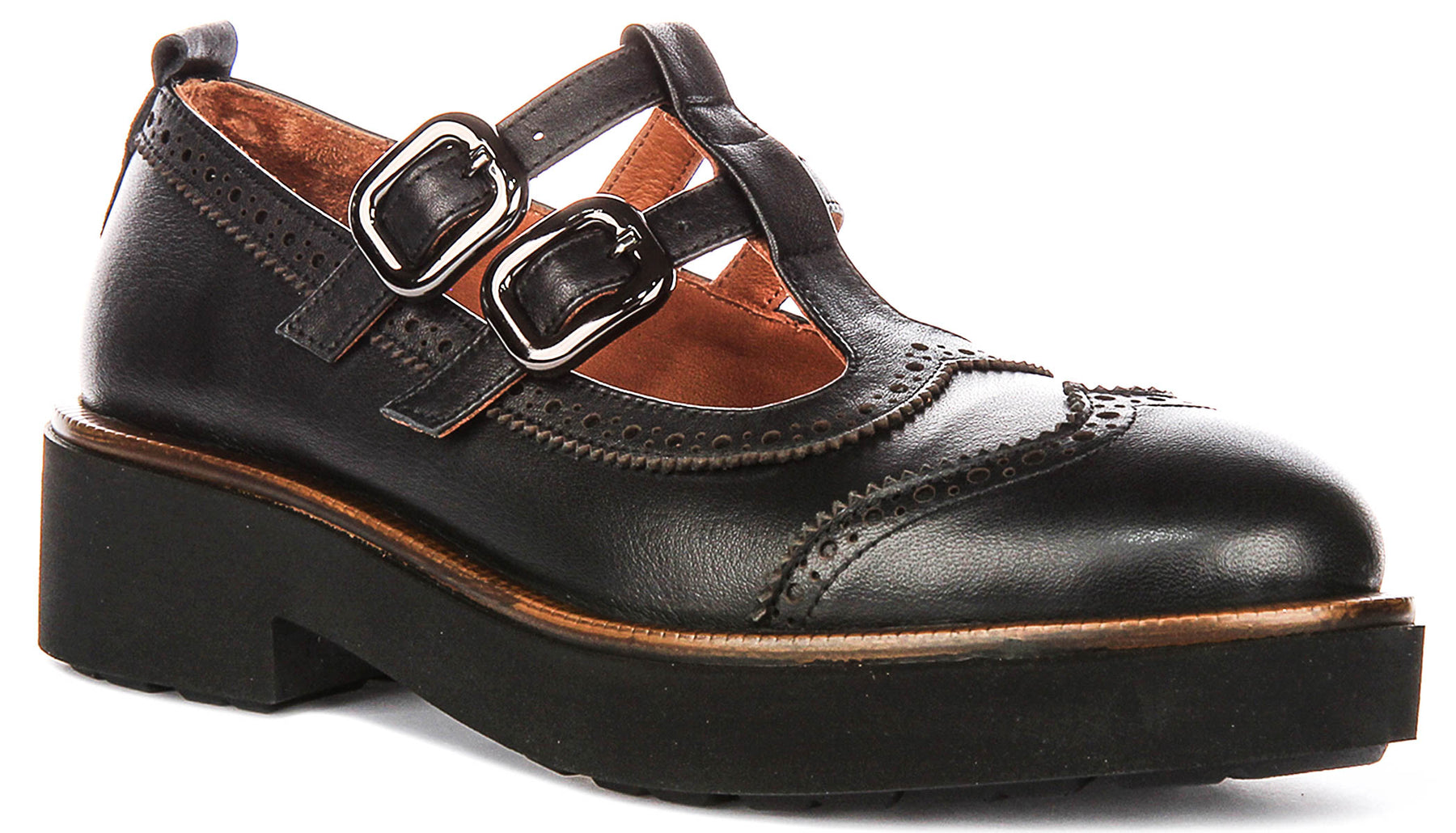 The design is elevated by a distinctive T-bar strap system, featuring two adjustable buckle fastenings with sleek silver-tone hardware. These straps not only provide a secure and customisable fit, ensuring comfort throughout your day, but also add a striking visual element to the classic silhouette.