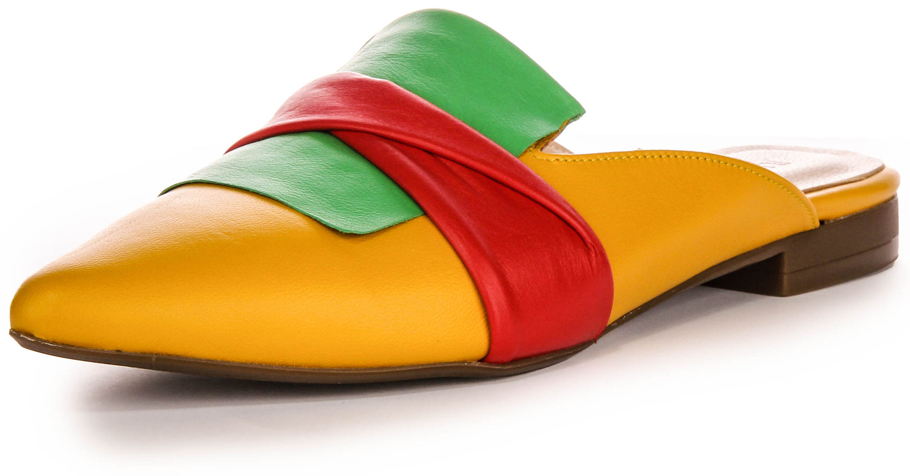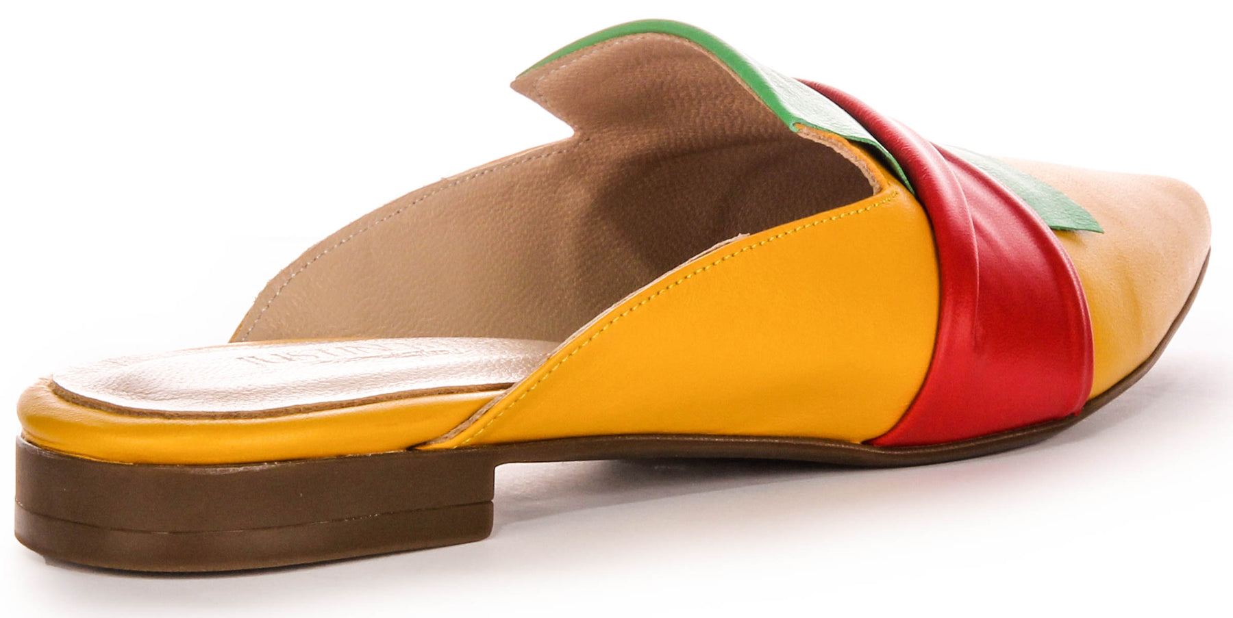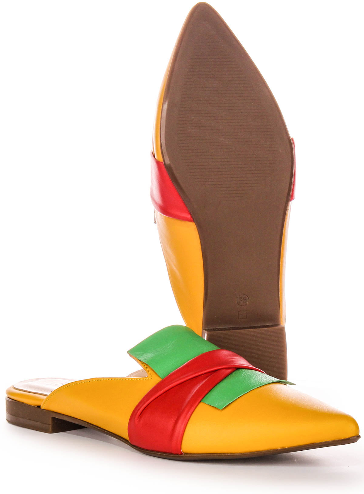 These open toe flats feature a vibrant yellow and red color combination, creating a lively and eyecatching look. The flat design ensures comfort and ease, making these sandals an ideal choice for casual outings where you want to showcase a fashionable flair.