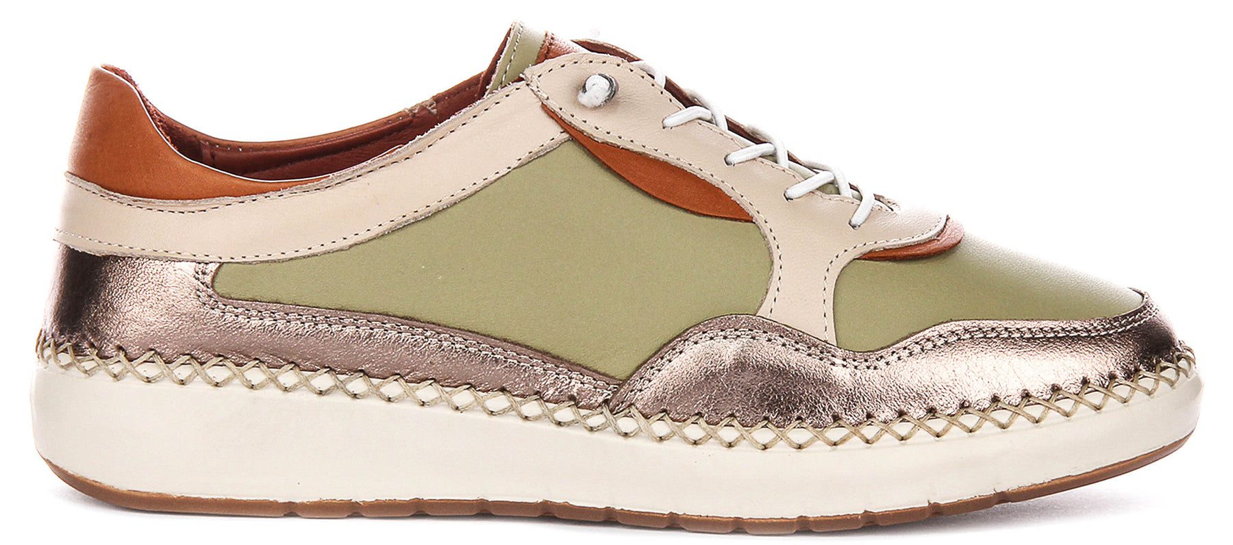 Crafted from premium quality leather, the Taylor shoes feature a captivating multi-panel design in a sophisticated colour palette. The main body showcases a soft sage green leather, beautifully complemented by creamy beige overlays around the lacing system and side accents. Rich tan brown details are thoughtfully incorporated on the heel tab and as subtle highlights on the lacing area, adding depth and warmth to the overall aesthetic.