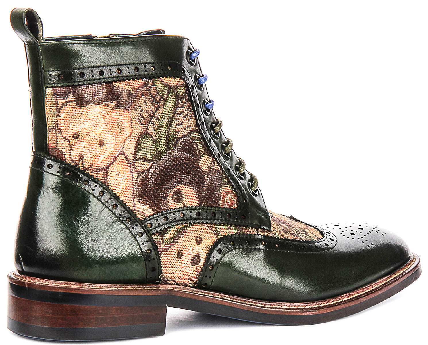 These men’s ankle boots feature a lace-up front with contrasting eyelets—subtly mixing olive green and blue for an added hint of contemporary flair. The side zip fastening makes them easy to slip on and off, while the sturdy heel tab offers extra convenience. The interior is thoughtfully constructed to provide a supportive and comfortable fit, making these boots ideal for everyday wear as well as special occasions.